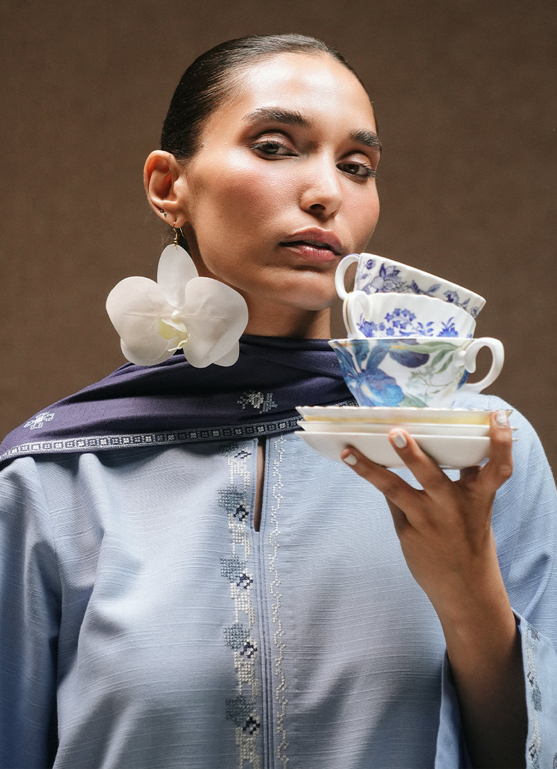The Blue Khaddar Embroidered 3 PC Suit from Winter Pret '24 Collection. A straight silhouette, round neckline with a slit, full length embroidered sleeves paired with an embroidered shalwar and shawl.