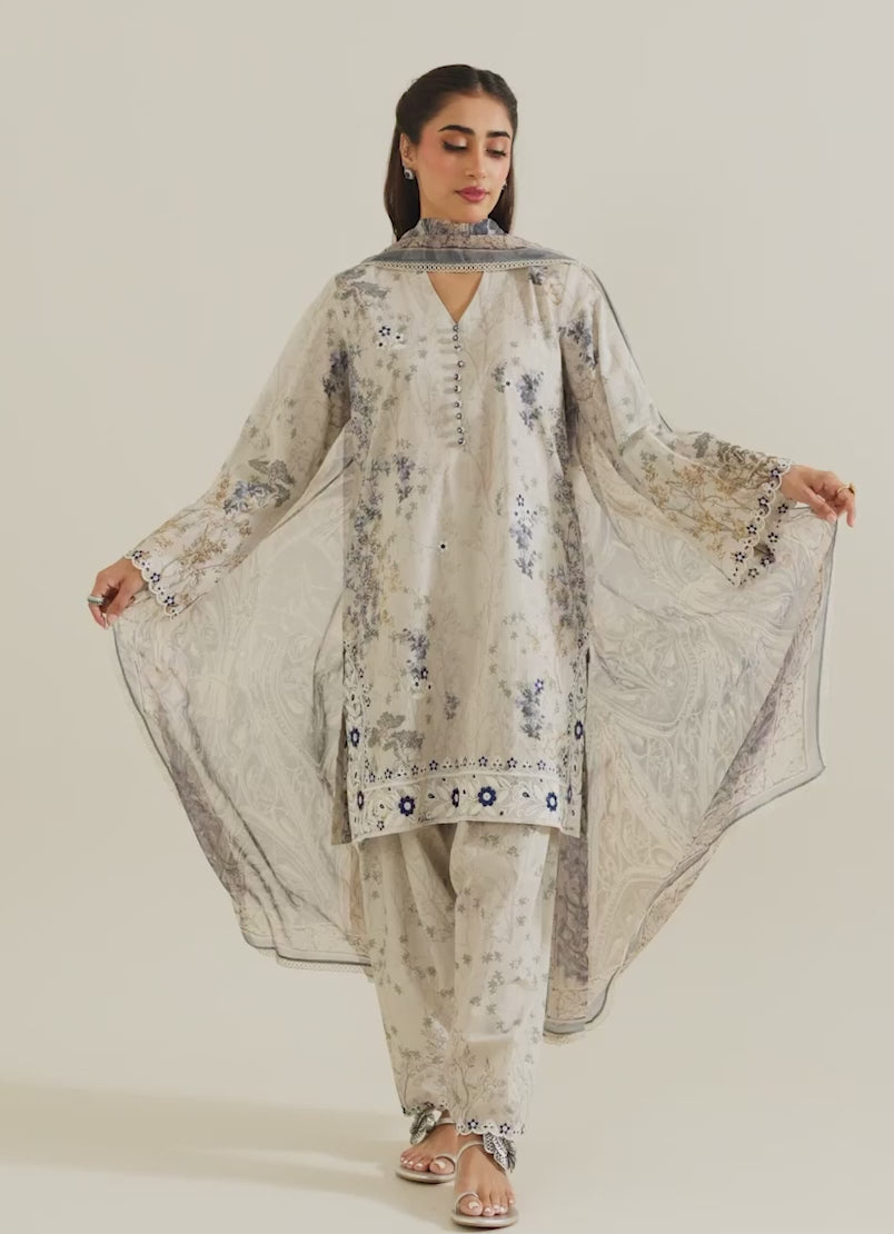The Light Grey Cotton/Chiffon Embroidered 3pc Suit from our IM Print category features V neckline & full-length bell sleeves paired with embroidered shalwar & dupatta.