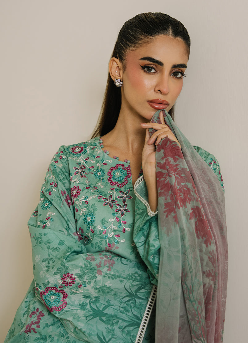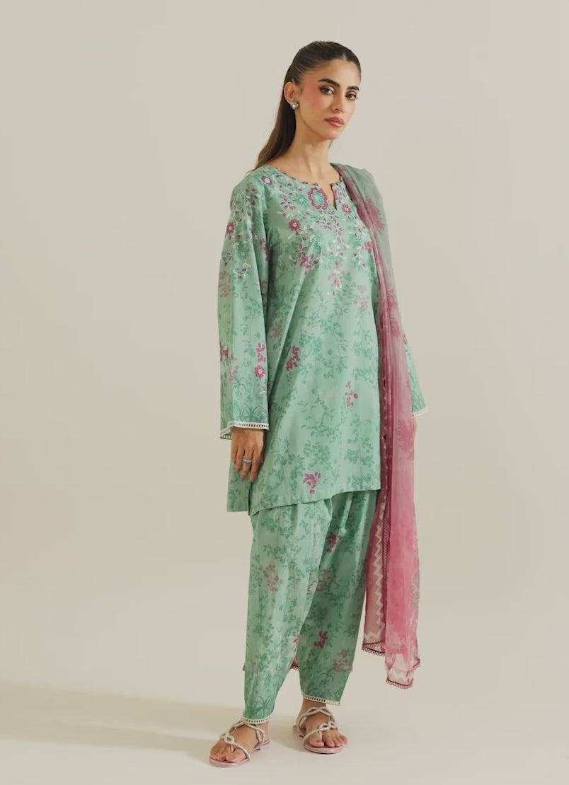 The Green Cotton/Chiffon Embroidered 3pc Suit from our IM Print category features round neckline with a slit & full-length bell sleeves paired with straight shalwar & dupatta.