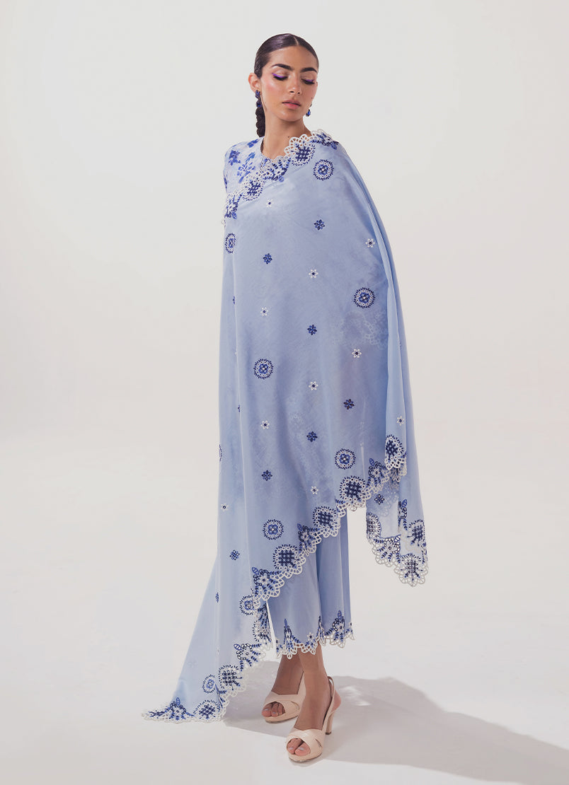The Blue Green Cotton 3PC Embroidered Printed Suit from our Spring Collection features a printed shirt with cutwork embroidery, round neckline with a slit, three quarter sleeves, paired with cutwork embroidered trouser & dupatta.