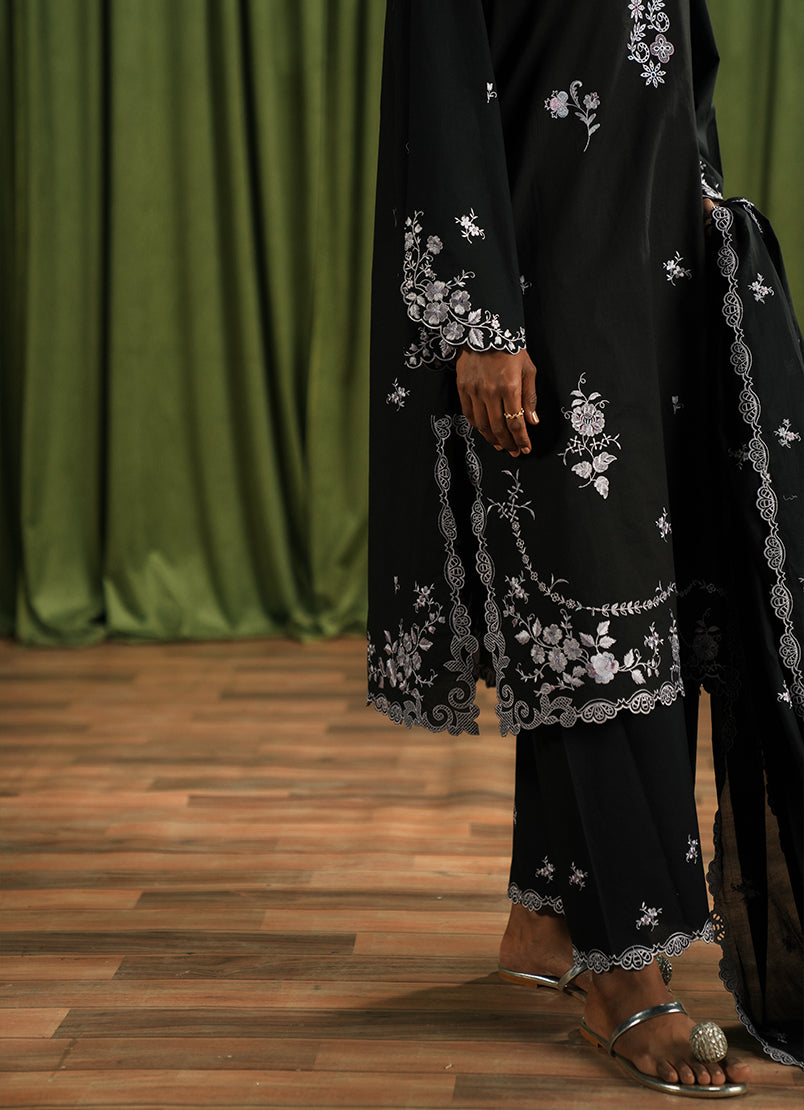 The Black Cotton Embroidered 3-Piece Suit from our Spring The Tea '25 Collection features a straight silhouette, round neckline, full length embroidered sleeves, paired with embroidered izaar & dupatta.