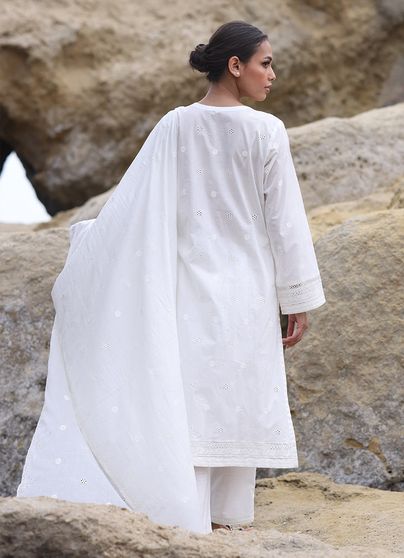 The White Cotton Embroidered 3-Pc Suit from our Spring Pret '25 collection features an embroidered shirt with V neckline paired with embroidered trousers & dupatta.
