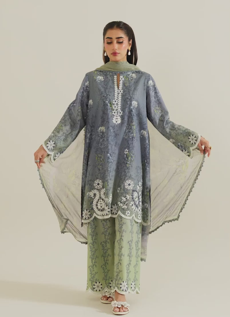 The Blue Cotton/Chiffon Embroidered 3pc Suit from our IM Print category features round neckline with a slit & full-length bell sleeves paired with embroidered trousers & dupatta.