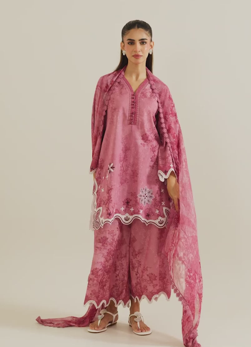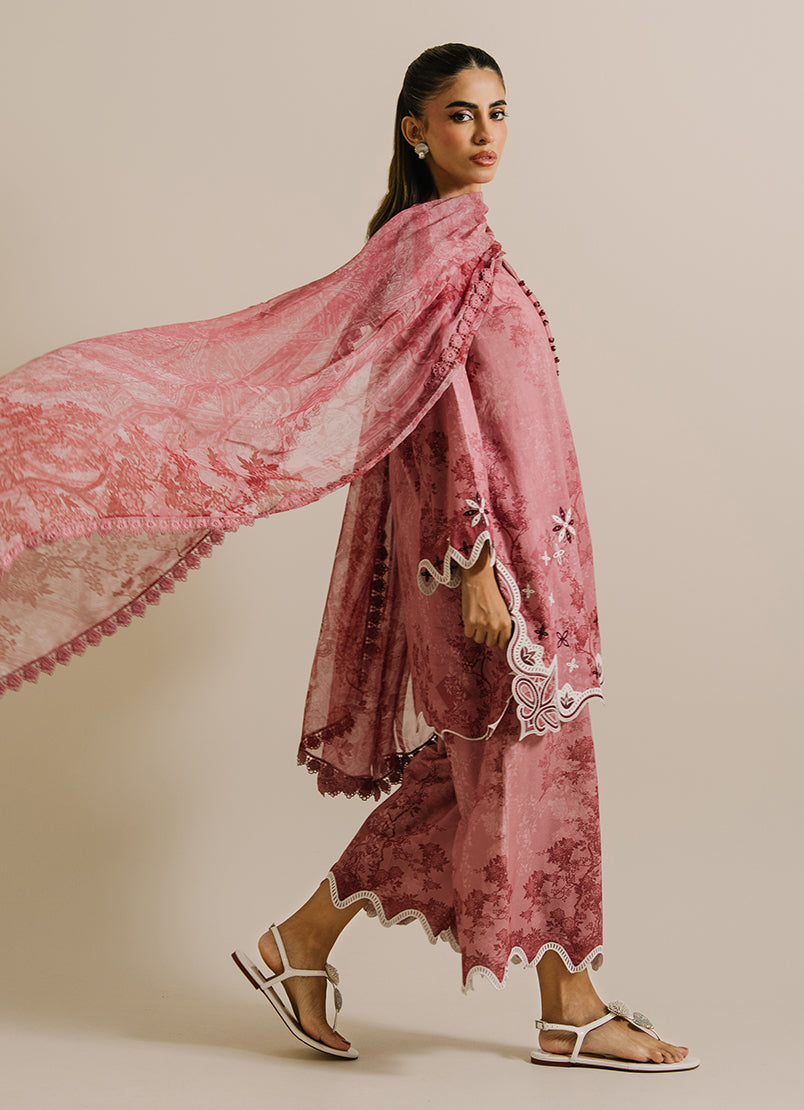The Tea Pink Cotton/Chiffon Embroidered 3pc Suit from our IM Print category features V neckline & full-length bell sleeves paired with embroidered trousers & dupatta.