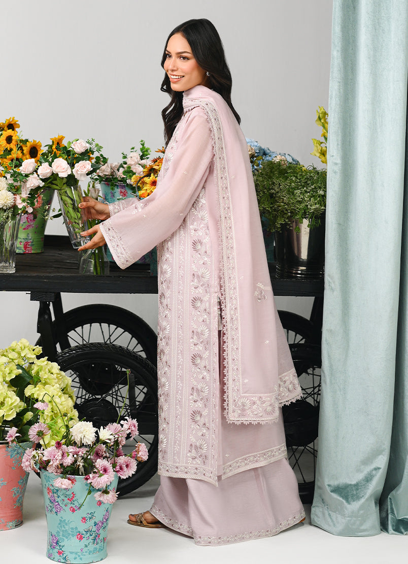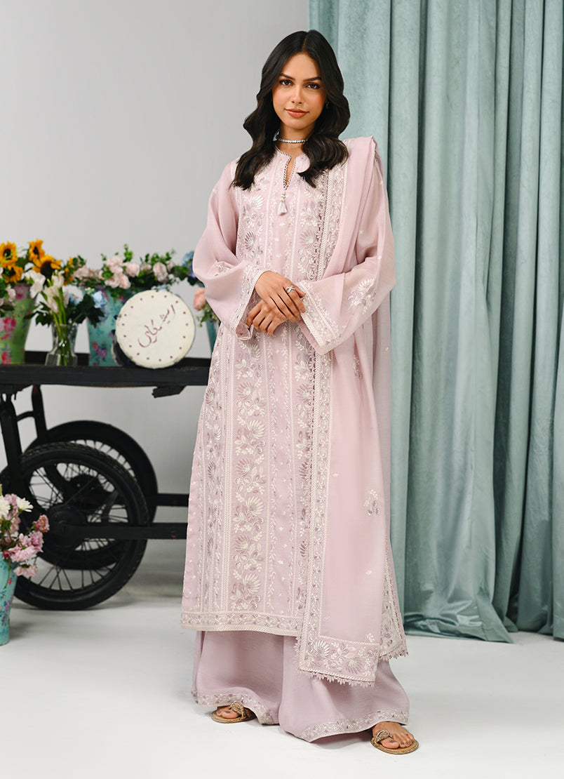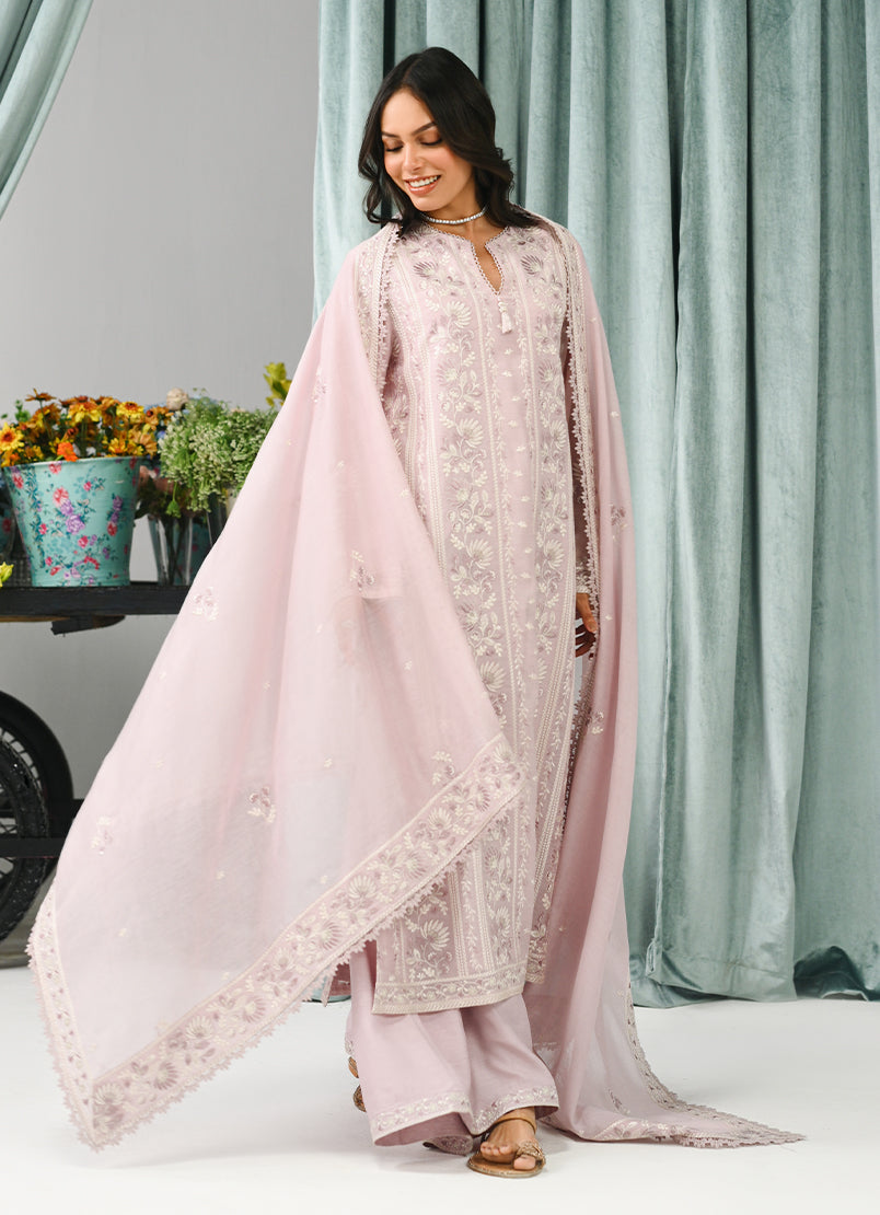 Aara is a graceful ensemble in a soft onion pink hue, defined by its fully embroidered silk chanderi front. Intricate detailing spreads seamlessly across the entire front panel, creating a rich, textured surface that reflects fine craftsmanship and refined artistry. The embroidery continues subtly along the back, sleeves, and neckline, maintaining harmony throughout the design. Paired with a dyed Thai silk camisole, raw silk embroidered trousers, and a silk chanderi dupatta finished with an embroidered pallu border, this look is timeless, elegant, and perfect for elevated occasions.