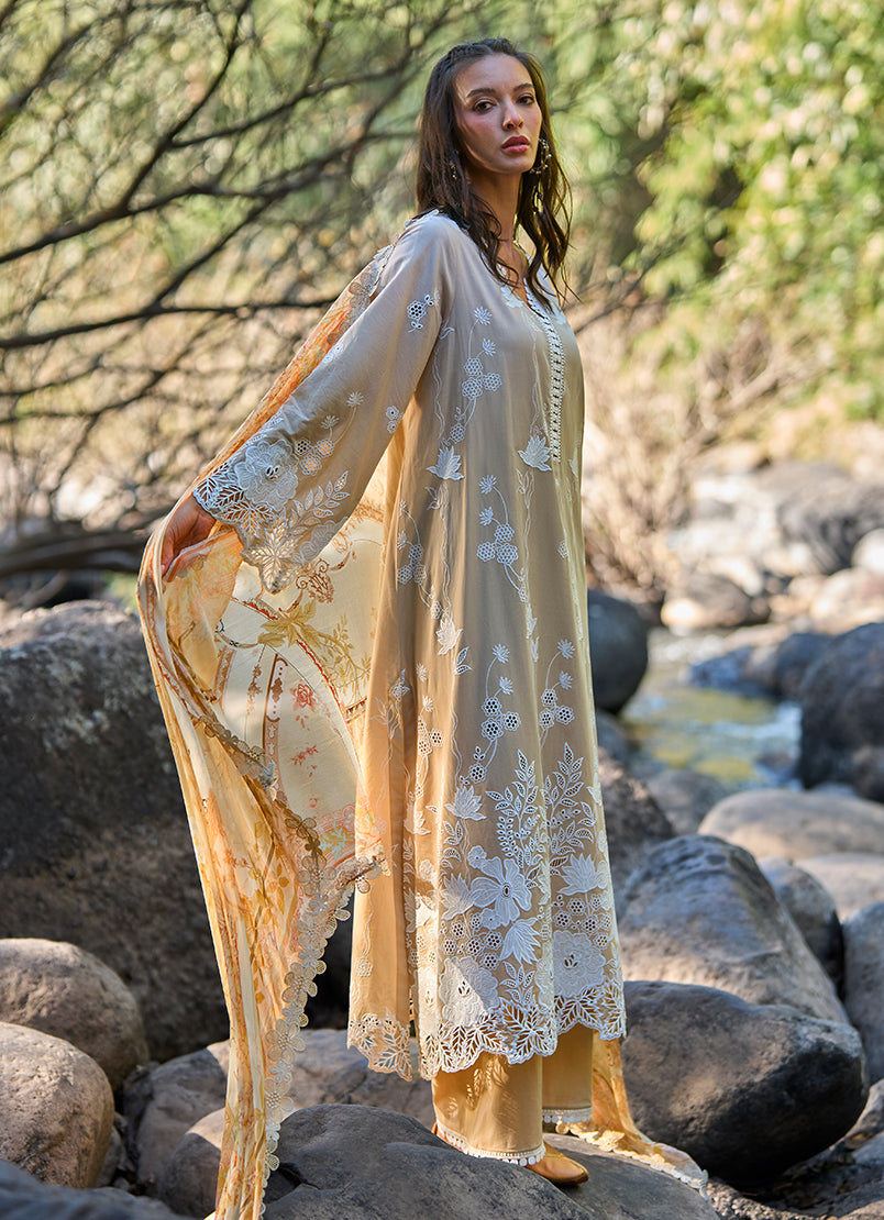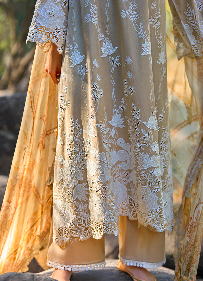 Deep and earthy in a coffee brown tone, this unstitched ensemble is crafted from pure cotton lawn, featuring finely embroidered floral motifs that flow gracefully across the fabric. Delicate cutwork accents and intricately designed borders add texture and depth, enhancing the richness of the base color. Paired with a pure cotton cambric trouser and a chiffon dupatta that complements the design, this set is ideal for refined summer dressing with a grounded, elegant appeal.