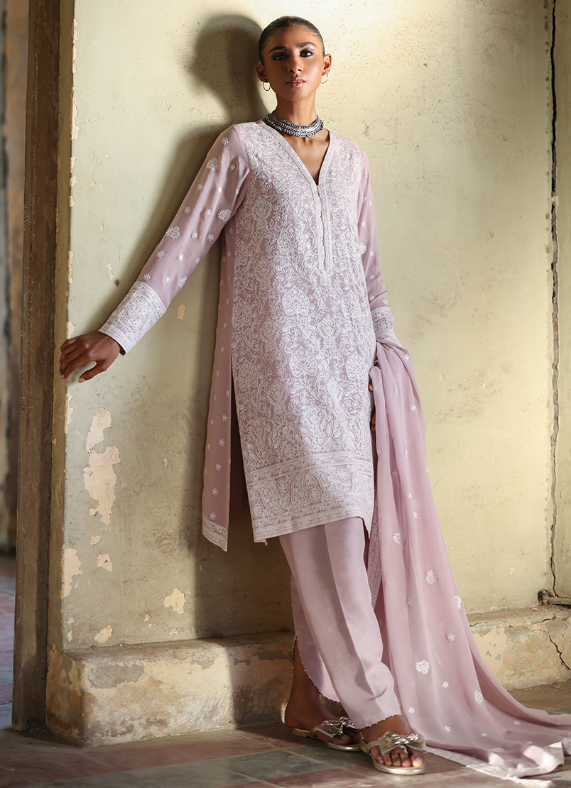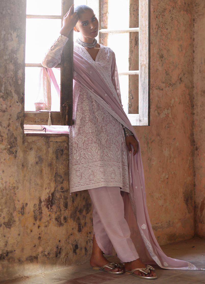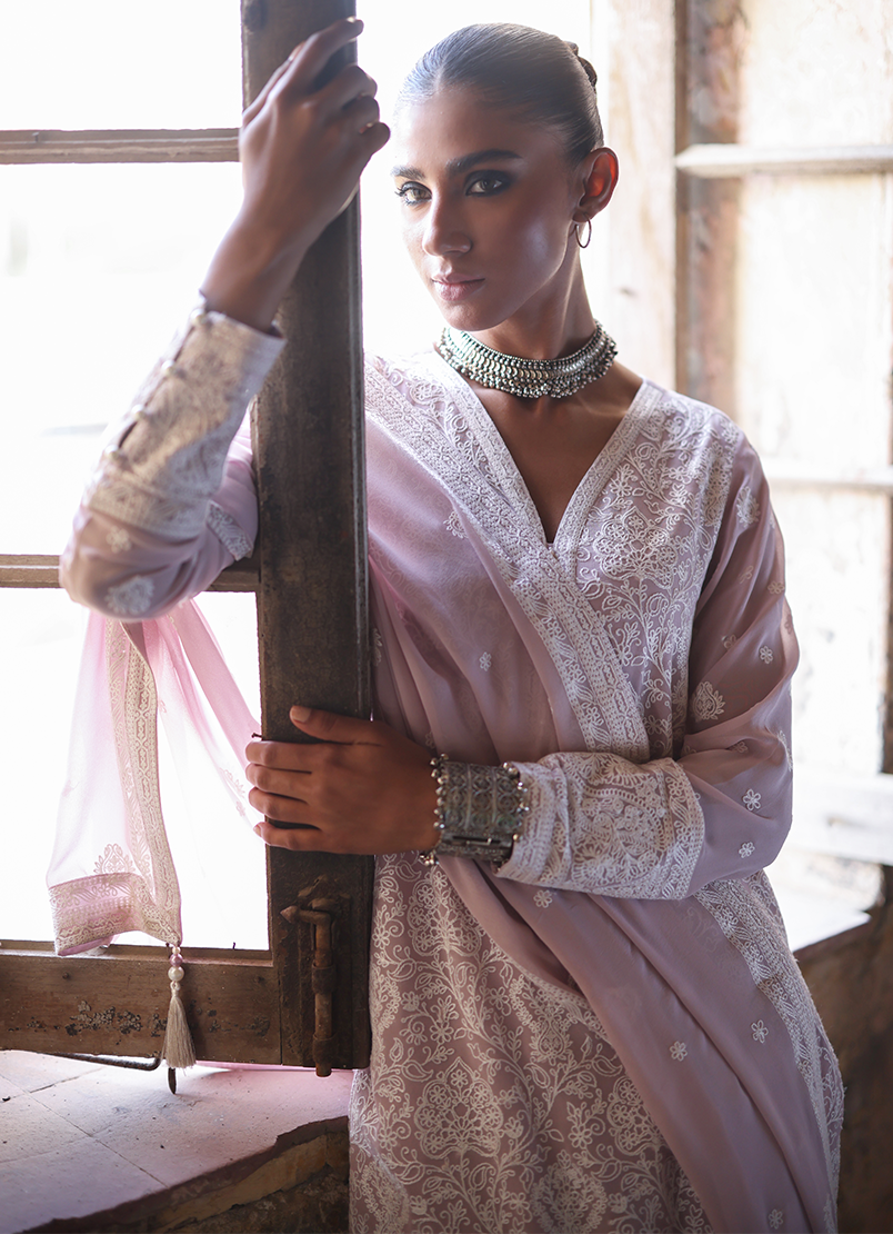 Azita in Mauve from our Reshamkari Collection. An Embroidered Pure Chinese Silk Georgette 4-piece outfit paired with trousers & dupatta.