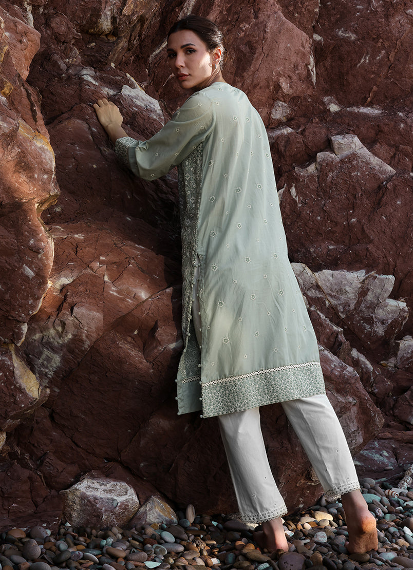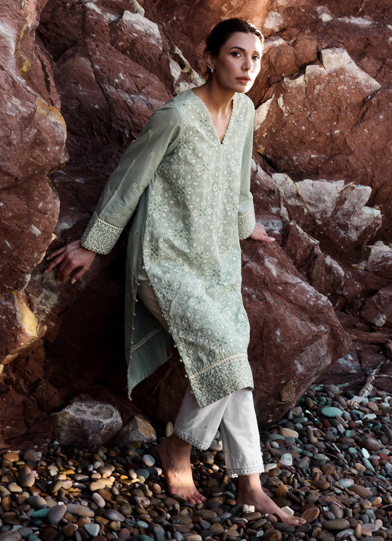 The Olive Green/White Cotton Embroidered Co-ord Set from Spring Pret '25 collection features an embroidered shirt with V neckline paired with an embroidered trousers.