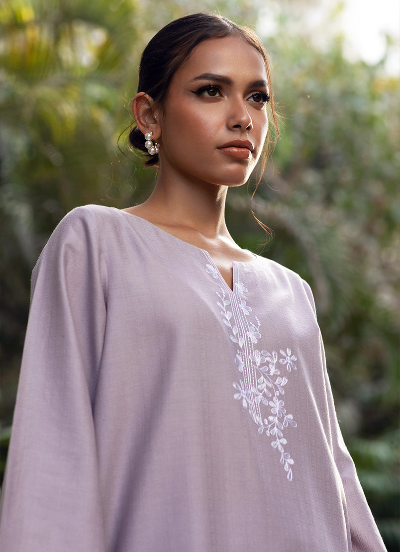 The Stone Grey Jacquard Embroidered Co-ord Set from Summer Essence ‘25 collection, features a round neckline with a slit with full length sleeves paired with a straight shalwar.