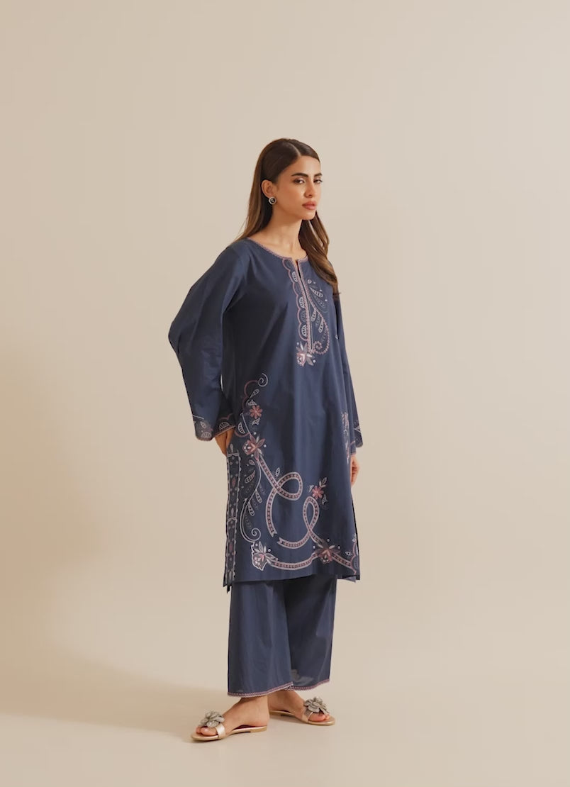 The Blue Cotton Embroidered Co-ord Set from our Image Signature category features a round neckline with a slit & full-length bell sleeves paired with embroidered trousers.