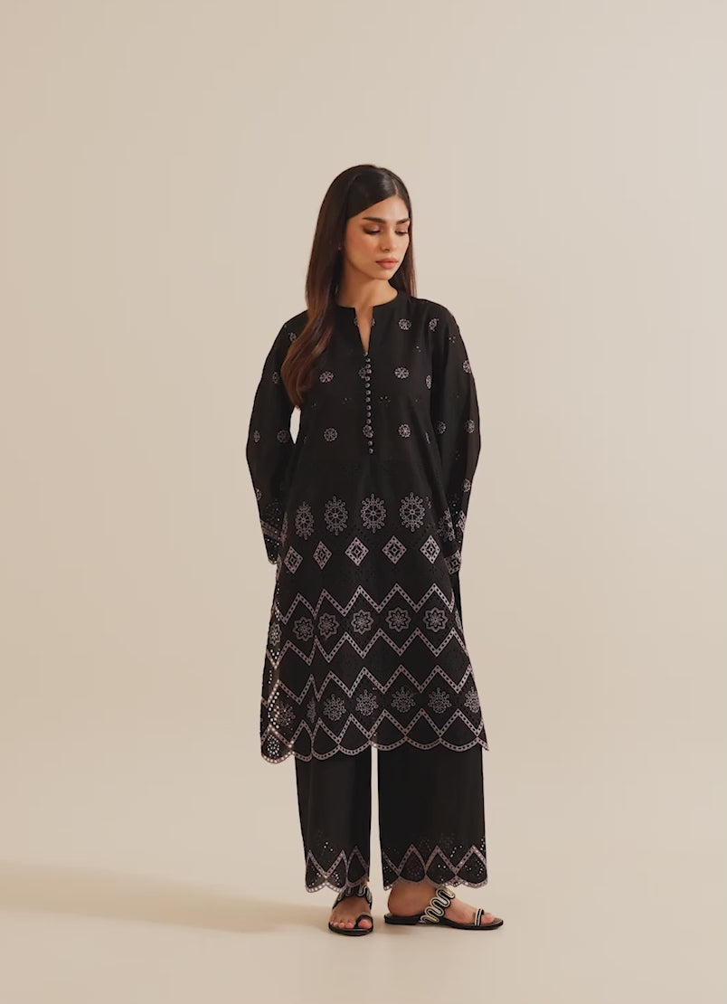 The Black Cotton Embroidered Co-ord Set from our Image Signature category features a round neckline with a slit & full-length bell sleeves paired with embroidered trousers.