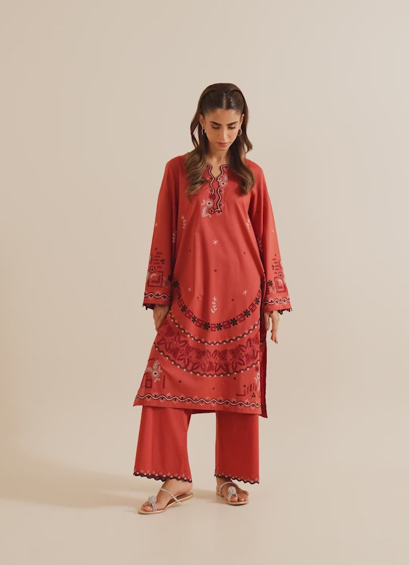 The Rust Cotton Embroidered Co-ord Set from our Image Signature category features a round neckline with a slit & full-length bell sleeves paired with embroidered trousers.