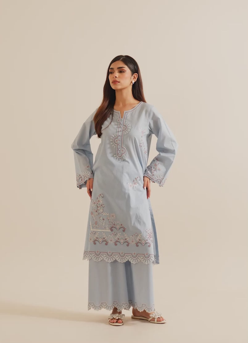 The Light Blue Cotton Embroidered Co-ord Set from our Image Signature category features a round neckline with a slit & full-length bell sleeves paired with embroidered trousers.