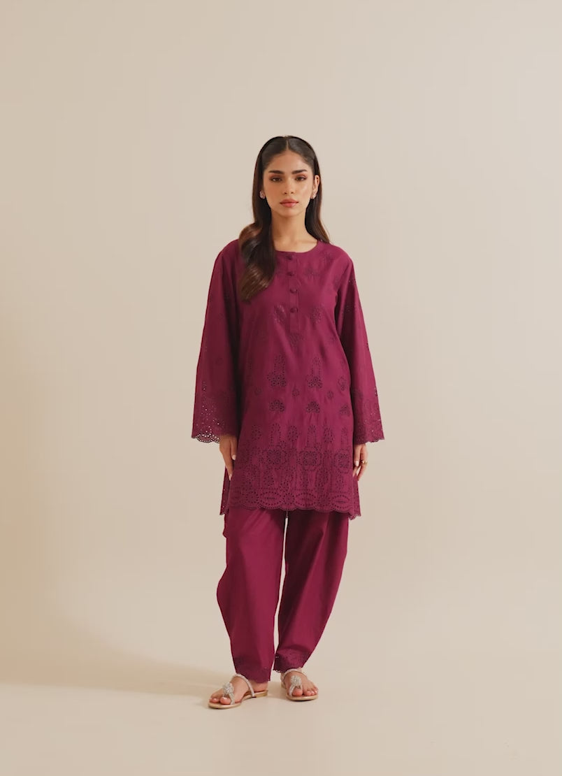 The Deep Wine Cotton Embroidered Co-ord Set from our Image Signature category features a round neckline & full-length bell sleeves paired with an embroidered shalwar.