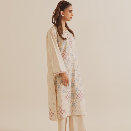 The Kora Cotton Embroidered Co-ord Set from our Image Signature category features a round neckline with a slit & full-length bell sleeves paired with embroidered trousers.