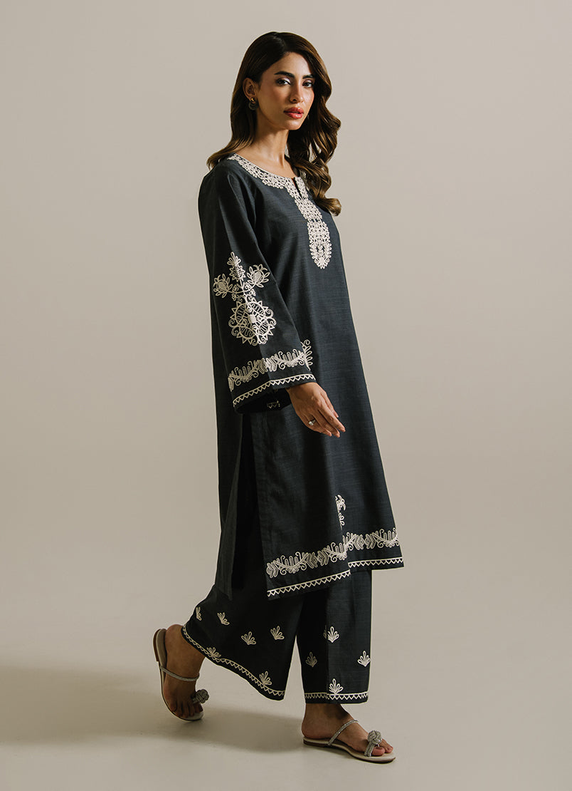 The Charcoal Grey Yarn Dyed Embroidered CO-ORD Set from our Image Daily category features round neckline with a slit & full-length bell sleeves paired with embroidered trousers.