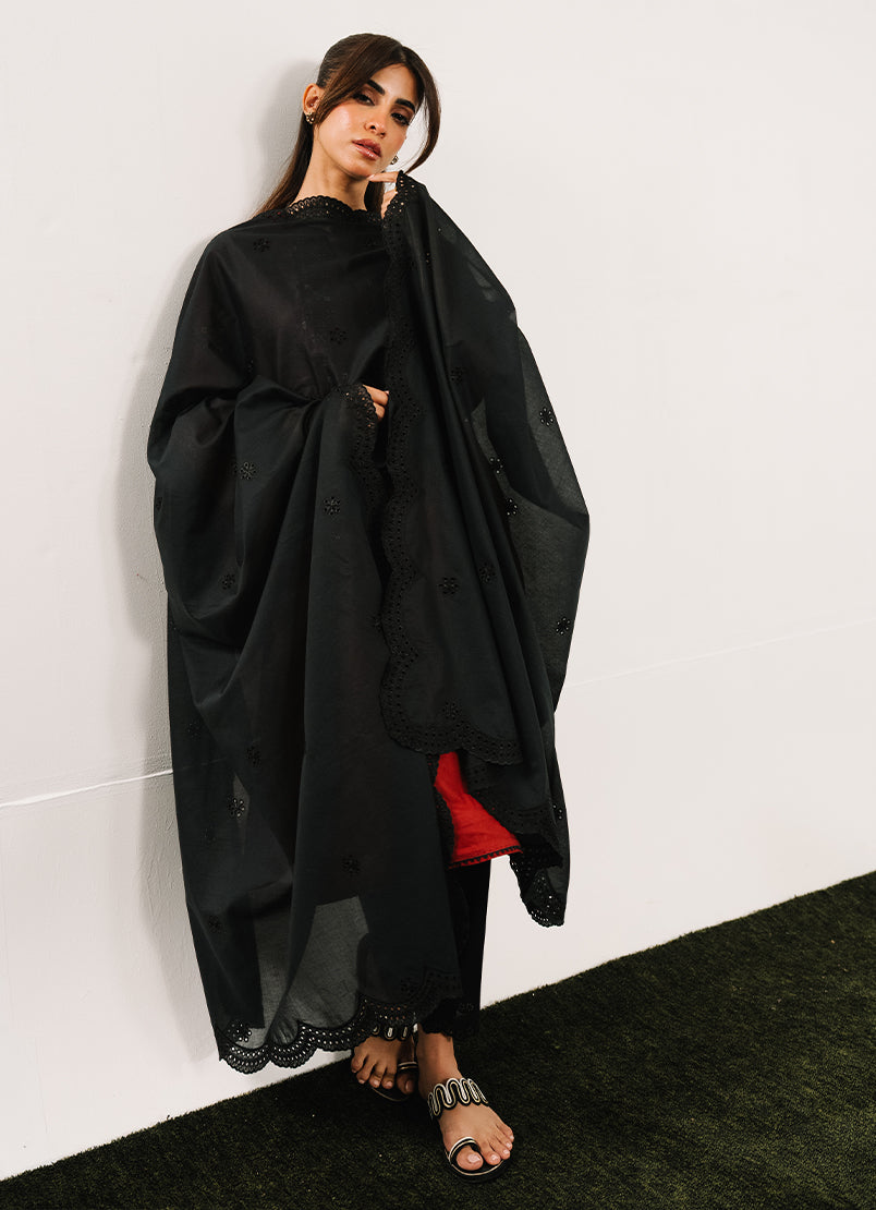 A classic black dupatta finished with intricate scalloped lace edging and subtle tonal embroidery. Sheer, refined, and effortlessly elegant, the perfect finishing layer for a polished look.