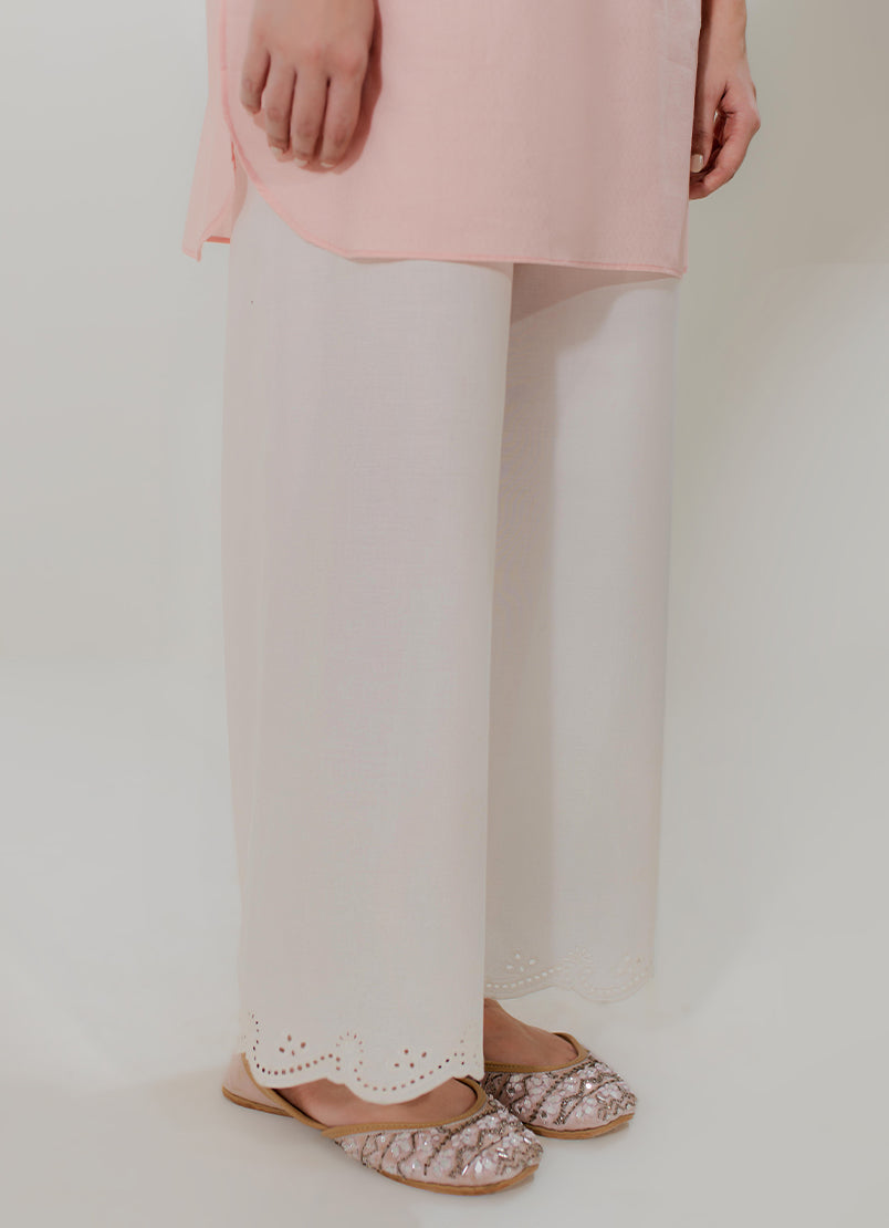 The White Embroidered Izaar from Spring Pret '25 Collection features a straight fit & scallop cutwork embroidery.