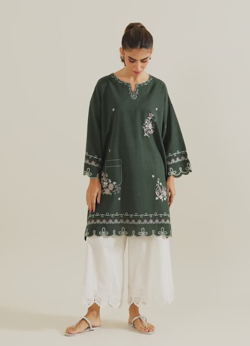 The Dark Green Yarn Dyed Embroidered Kurta from our Image Daily category features round neckline with a slit & full-length bell sleeves.