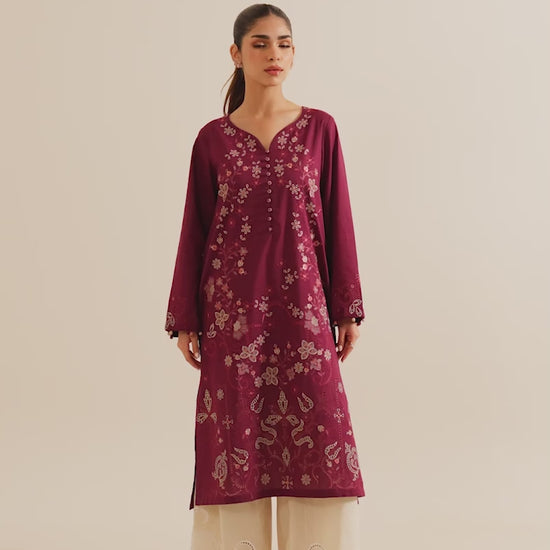 The Mauve Cotton Embroidered Kurta from our Image Signature category features V neckline & full-length bell sleeves.