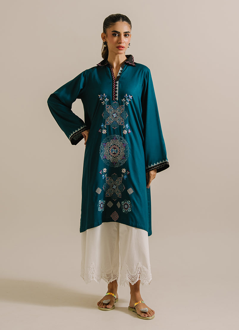 The Dark Teal Viscose Embroidered Kurta from our Image Basic category features a resort collar & full-length bell sleeves.