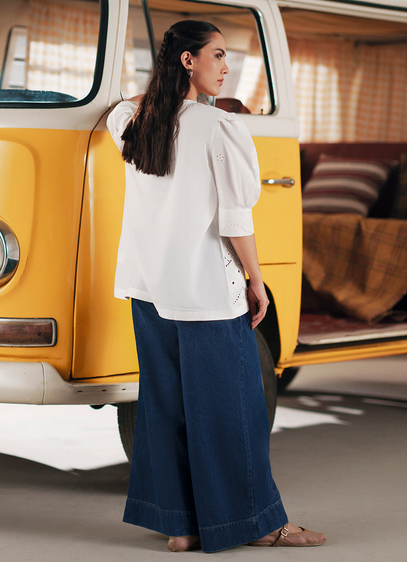 Crafted in a soft white fabric, this kurta showcases delicate schiffli embroidery scattered across the silhouette, lending it a refined and airy feel. The round neckline is finished with fabric tie details, adding a subtle touch of femininity. Intricate schiffli floral patterns along the hem enhance the design, while the relaxed fit ensures all day comfort. A timeless piece that beautifully balances craftsmanship with understated, everyday elegance.
