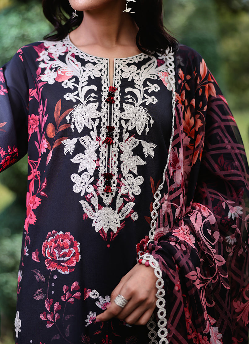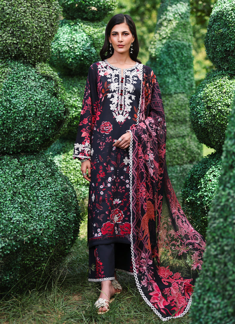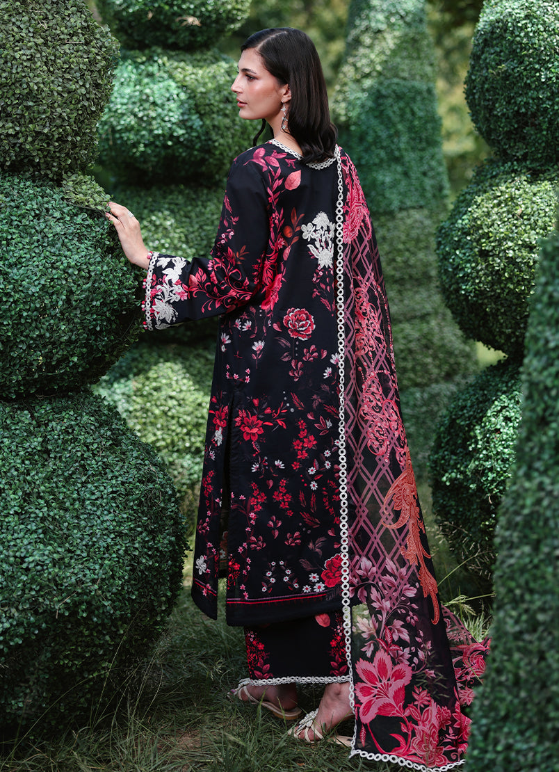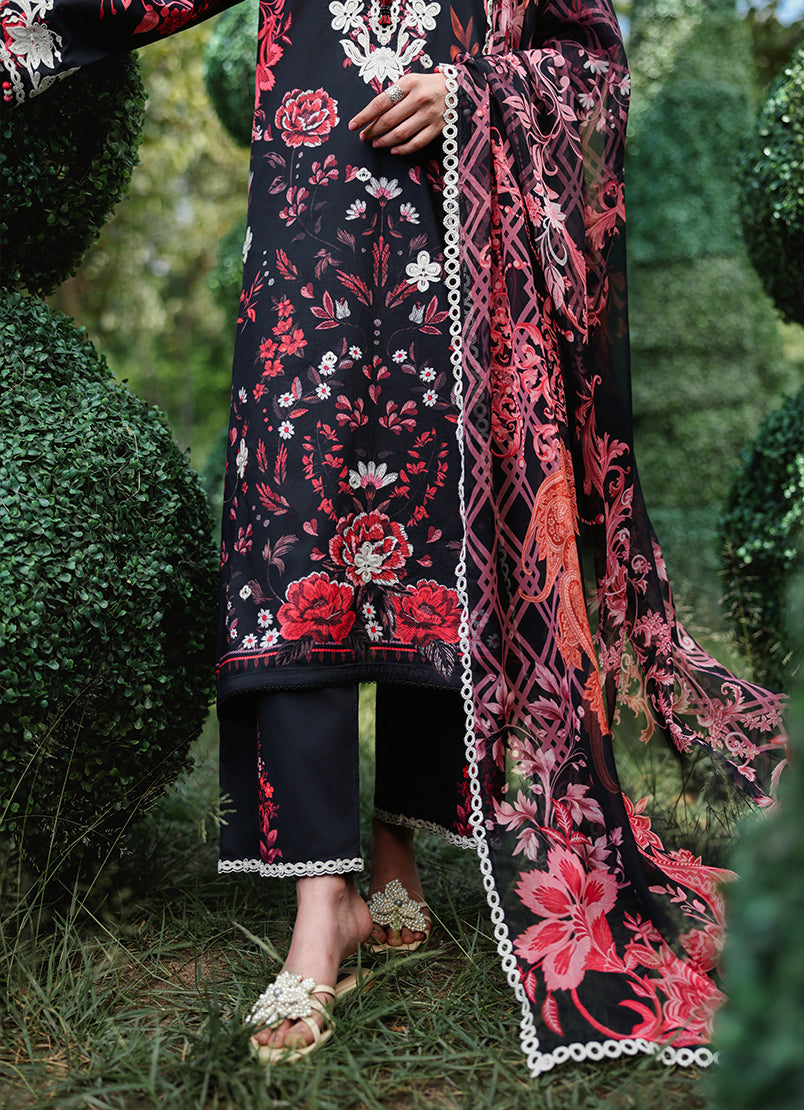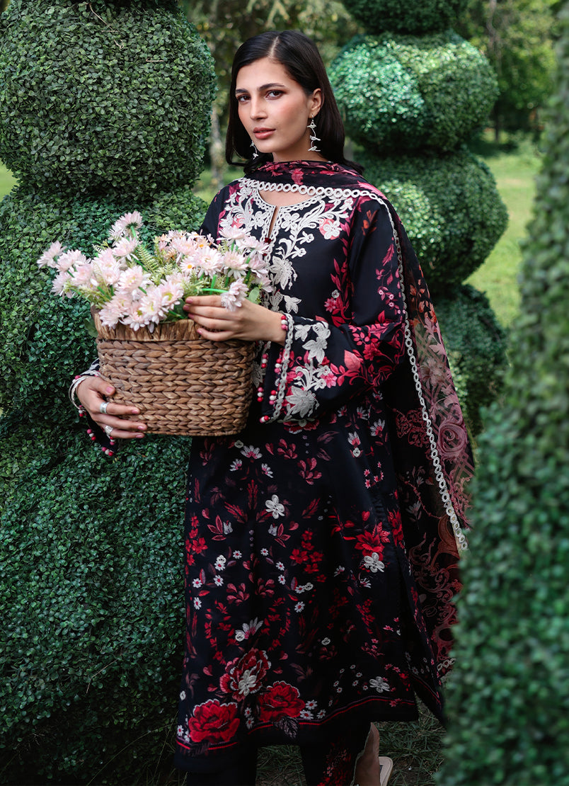Godar is a black unstitched 3-piece suit crafted in printed cotton, featuring striking floral motifs in rich red and soft ivory tones that create a bold, statement look. The shirt is detailed with an embroidered neckline, front, back, and sleeves, enhanced with intricate border accents. The printed trouser complements the design, while the digital printed chiffon dupatta adds depth and fluidity with its light, flowing drape.