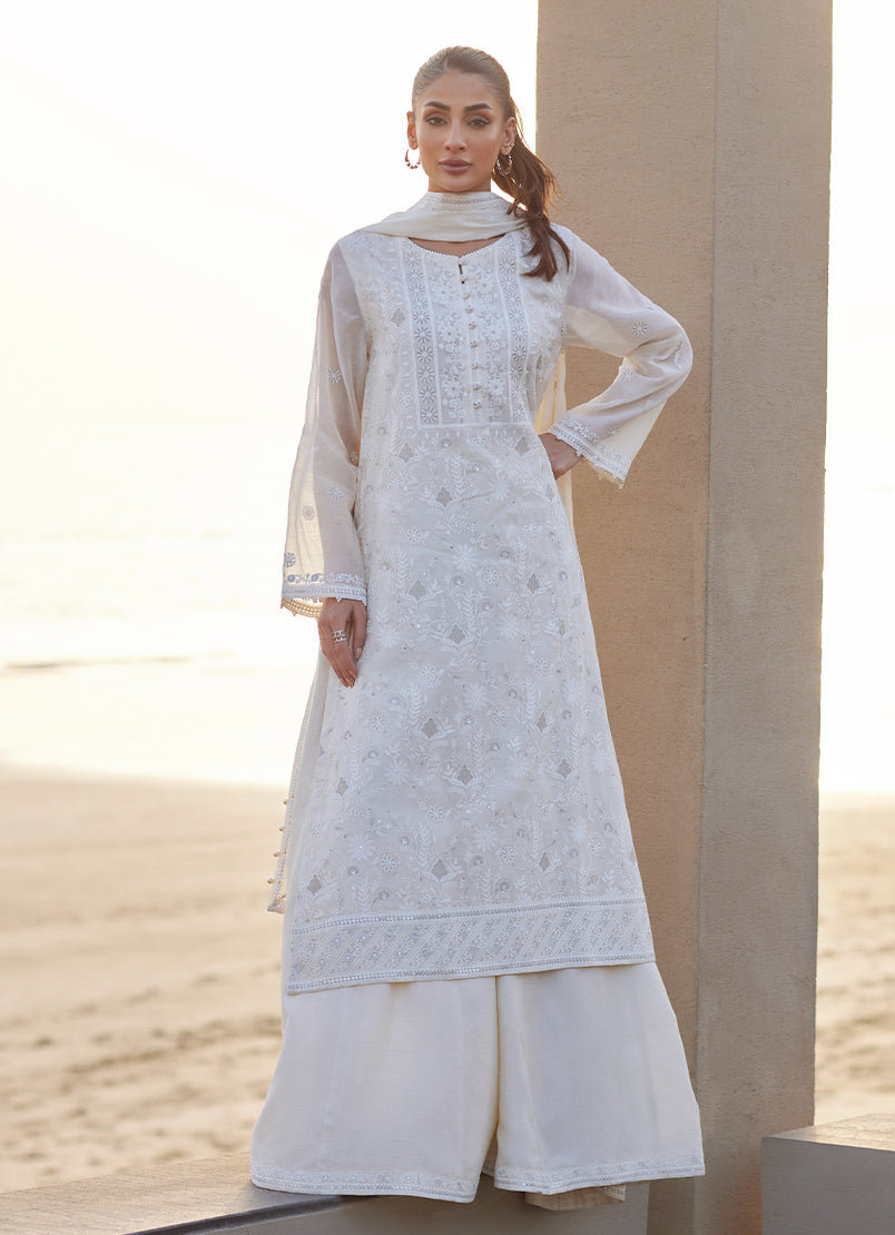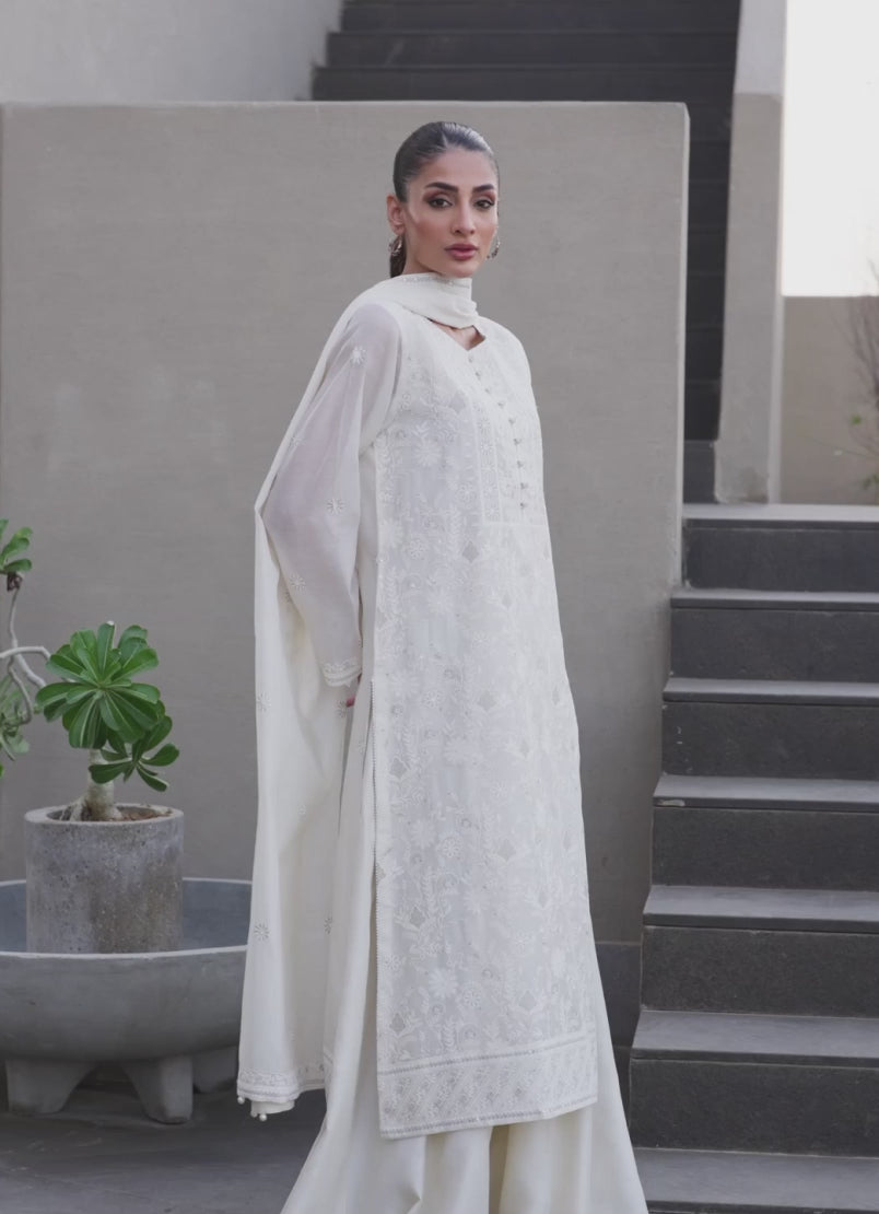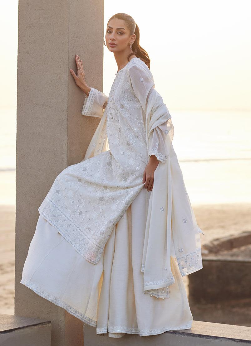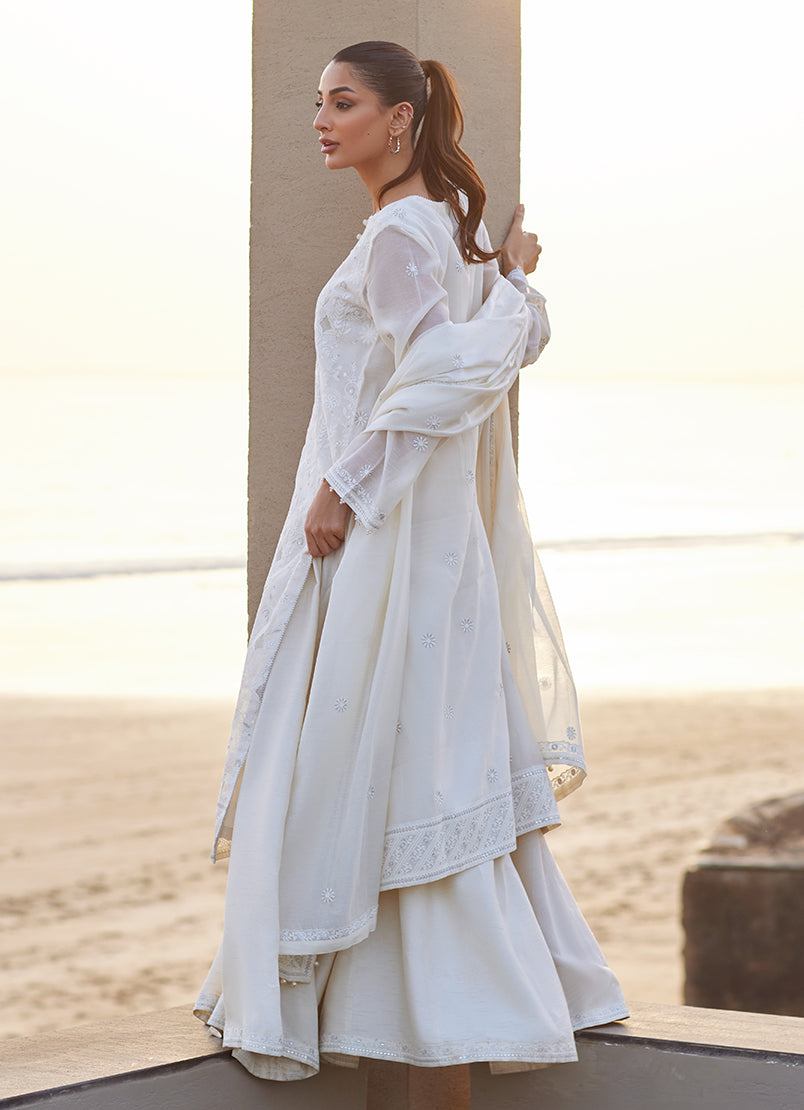 Graceful and serene, Haya captures the essence of timeless sophistication through its all-white silk chanderi canvas delicately embroidered with tonal threadwork. The ensemble’s intricate motifs and borders lend depth and texture, while the organza-like lightness of the fabric gives it a soft, ethereal presence. Paired with a raw silk embroidered trouser and a finely detailed dupatta, this four-piece set embodies refined minimalism and understated luxury, ideal for elegant daytime festivities or serene evening gatherings.