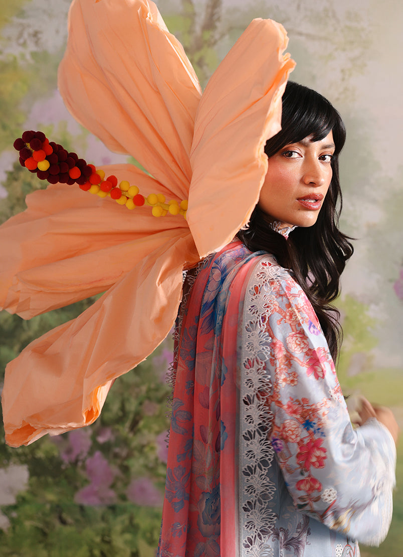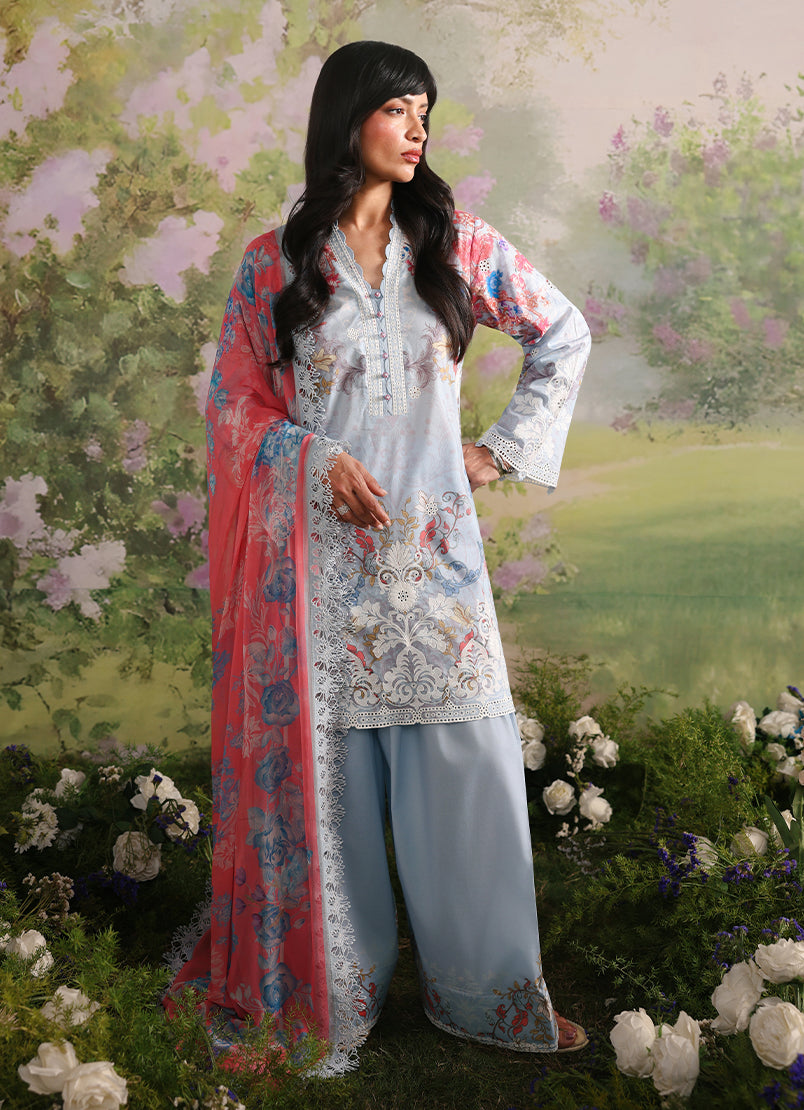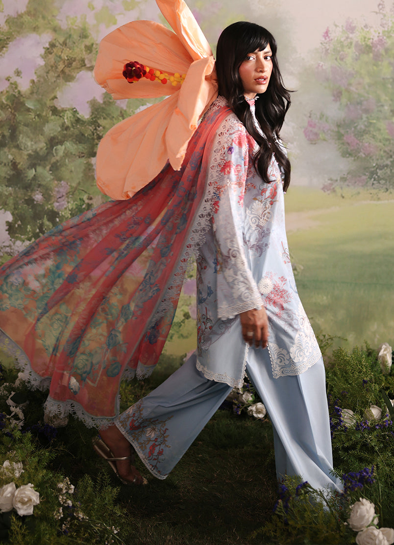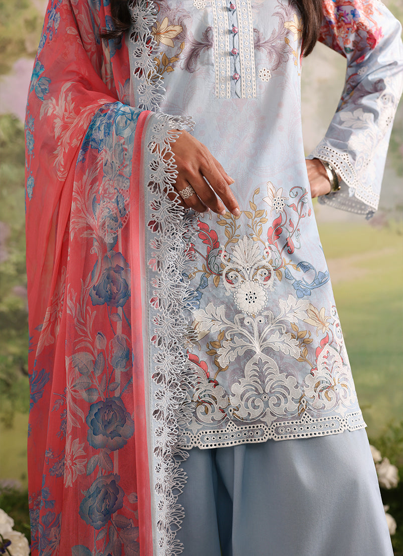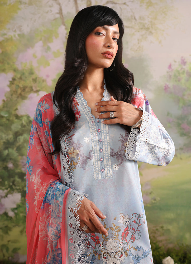 Icelet is a powder blue unstitched 3-piece suit crafted in printed cotton, featuring delicate floral motifs in soft ivory, blush, and muted tones that create a serene, refined appeal. The shirt is detailed with an embroidered neckline, front, back, and sleeves, finished with elegant border accents. The printed trouser complements the look, while the digital printed chiffon dupatta adds a light, airy flow with graceful movement.