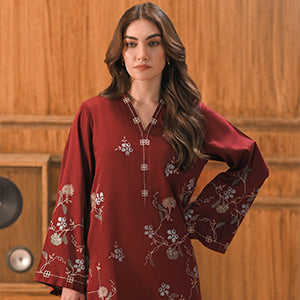 Leyan in Garnet Pink/Crimson from our Winterkari '25 Collection. An embroidered khaddar 3pc unstitched outfit paired with khaddar trousers & an acrylic shawl.