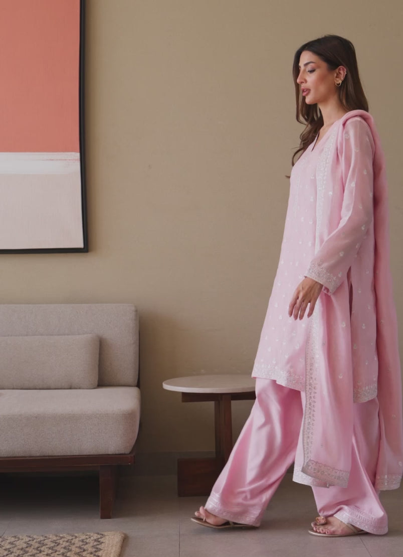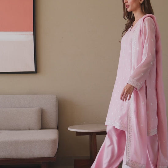 Soft, graceful, and exuding quiet sophistication, Nazo is an ode to timeless femininity. Rendered in a delicate blush pink tone, this silk chanderi ensemble features refined thread embroidery across the shirt, sleeves, and hemline, creating a subtle yet enchanting texture. Paired with a raw silk embroidered trouser and a matching dupatta adorned with an embroidered pallu border, this four-piece set captures understated luxury, perfect for daytime elegance or intimate festive gatherings.