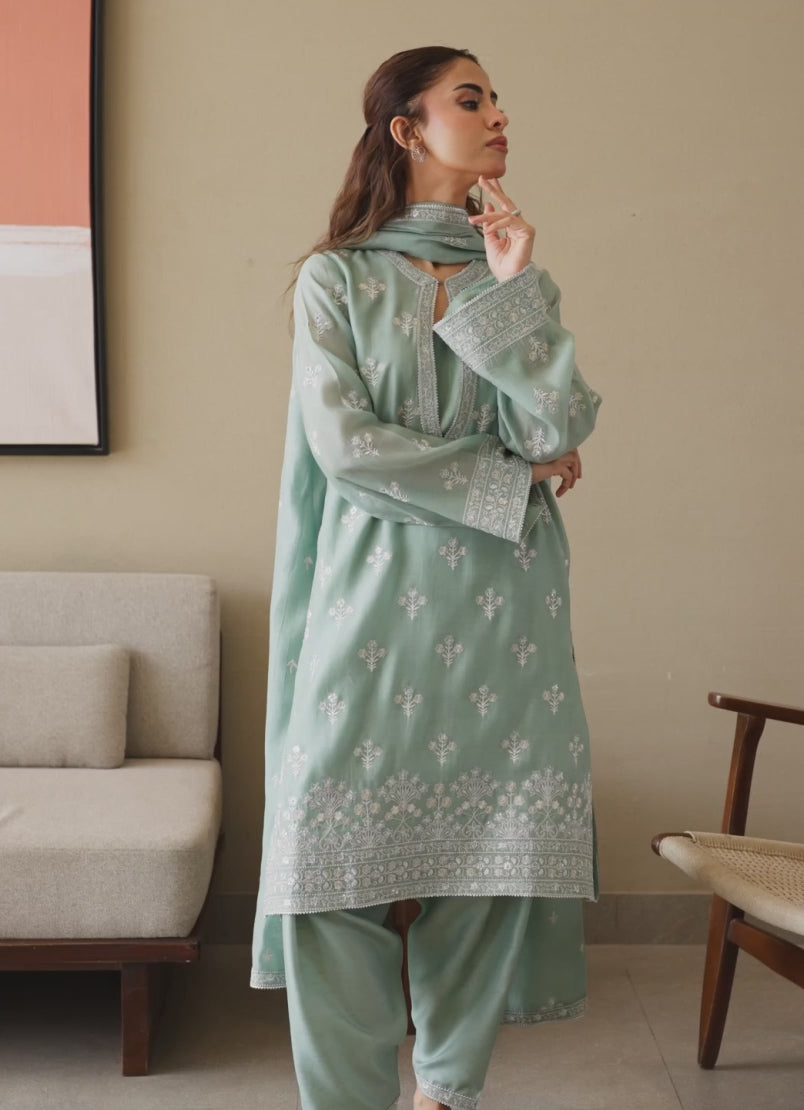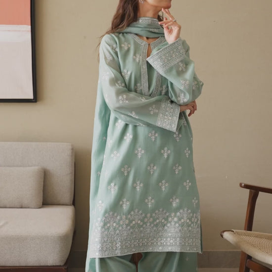 Refreshing and refined, Nerain channels serene sophistication through its sea-green silk chanderi canvas adorned with delicate ivory embroidery. The ensemble’s intricate motifs and detailed borders exude timeless charm, while the airy silhouette and subtle sheen of the fabric lend a touch of effortless grace. Paired with a raw silk embroidered trouser and a coordinating dupatta with an embellished pallu border, this four-piece set embodies understated elegance, perfect for daytime festivities or elegant soirées by the sea.
