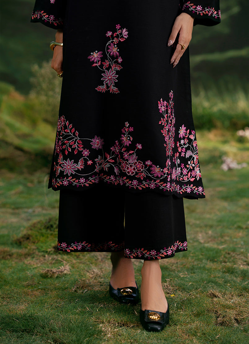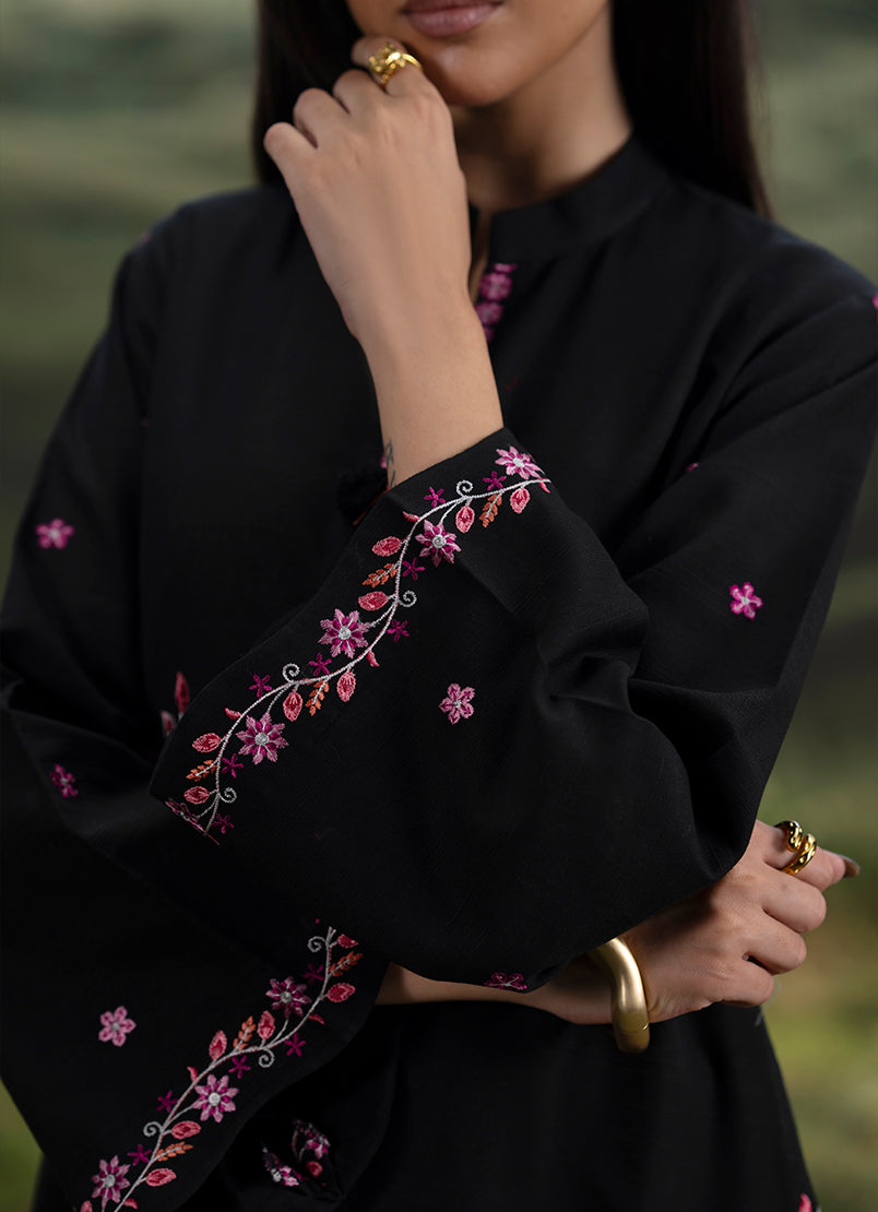 Nilofar in Black from our Winterkari '25 Collection. An embroidered khaddar 3pc unstitched outfit paired with khaddar trousers & an acrylic shawl.