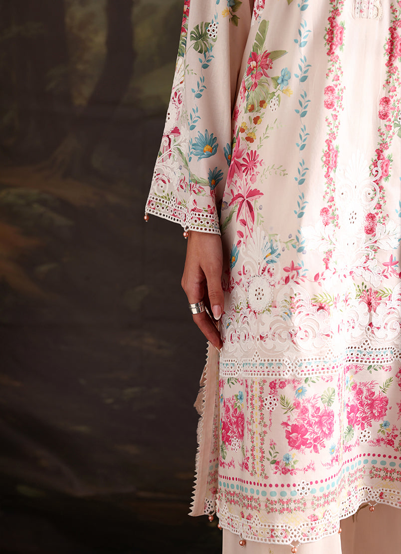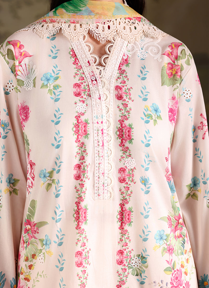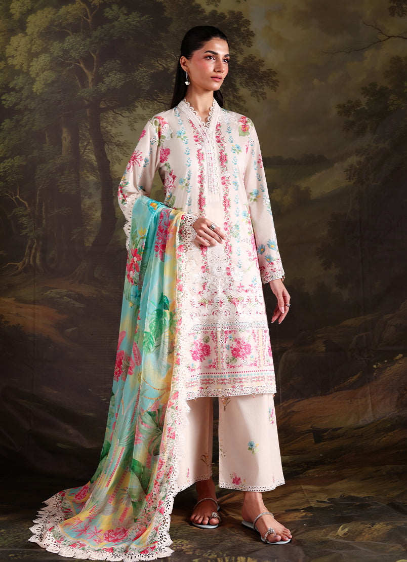 Rafae is an ivory unstitched 3-piece suit crafted in printed cotton, featuring delicate floral motifs in soft pink and pastel tones that create a graceful, timeless appeal. The shirt is detailed with an embroidered neckline, front, back, and sleeves, finished with refined border accents that enhance its elegance. The printed trouser complements the look, while the digital printed chiffon dupatta adds a light, airy flow with a soft, fluid drape.