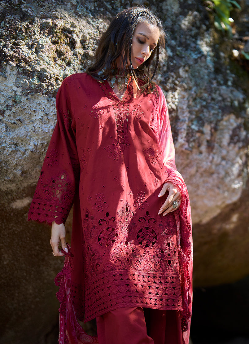This unstitched pure cotton lawn shirt is presented in a rich red tone, detailed with intricately composed floral and geometric fabric motifs that create a striking all-over pattern. The surface design is enhanced with decorative borders that add depth and structure to the fabric while maintaining visual balance. Paired with a pure cotton cambric trouser and a printed chiffon dupatta, the ensemble offers a breathable feel with bold, statement-making fabric detail suited for summer wear.