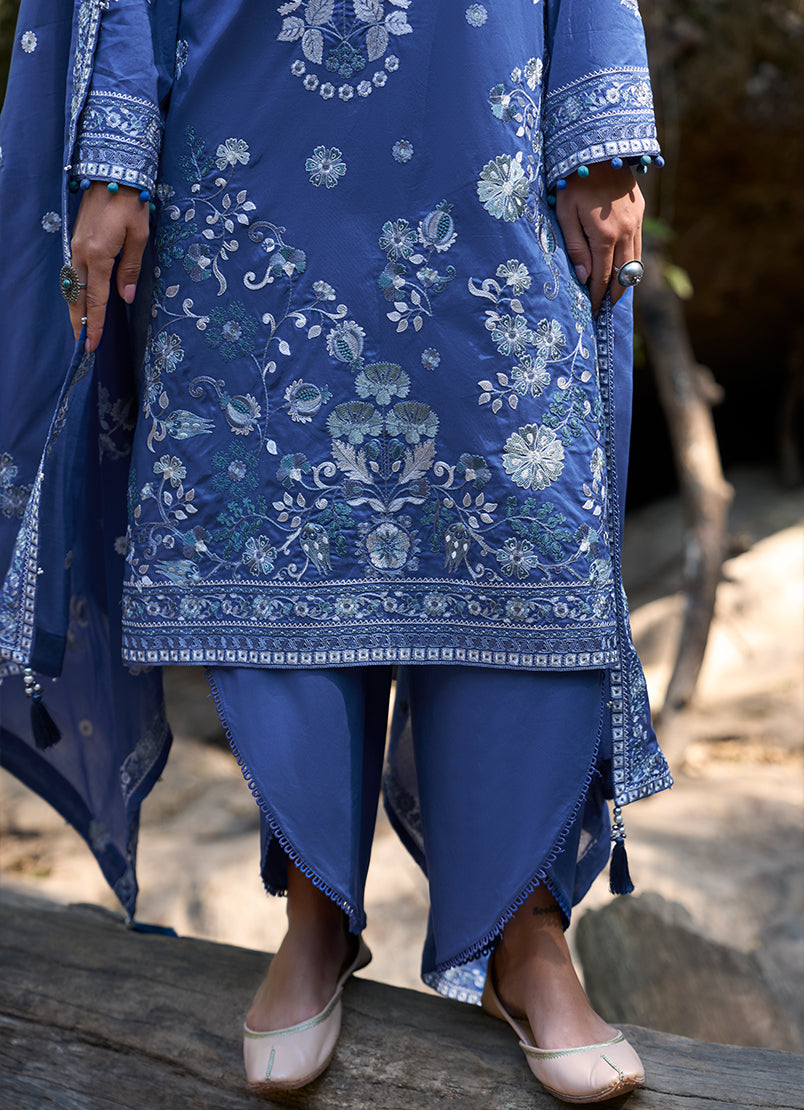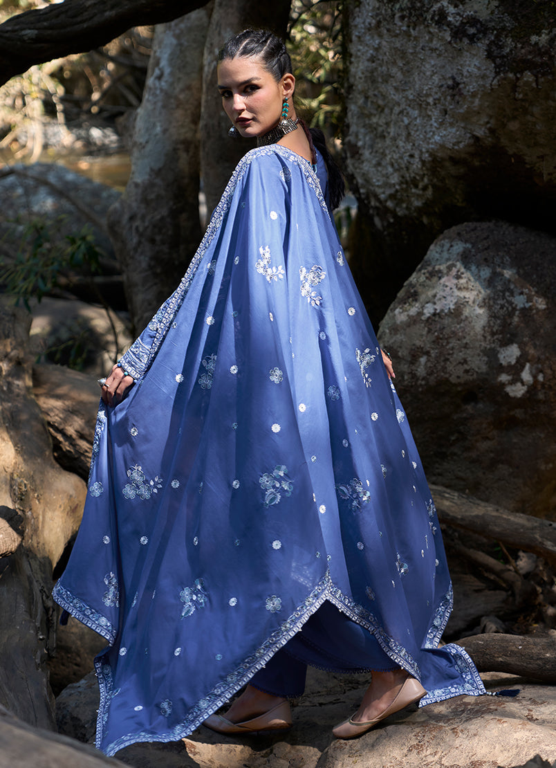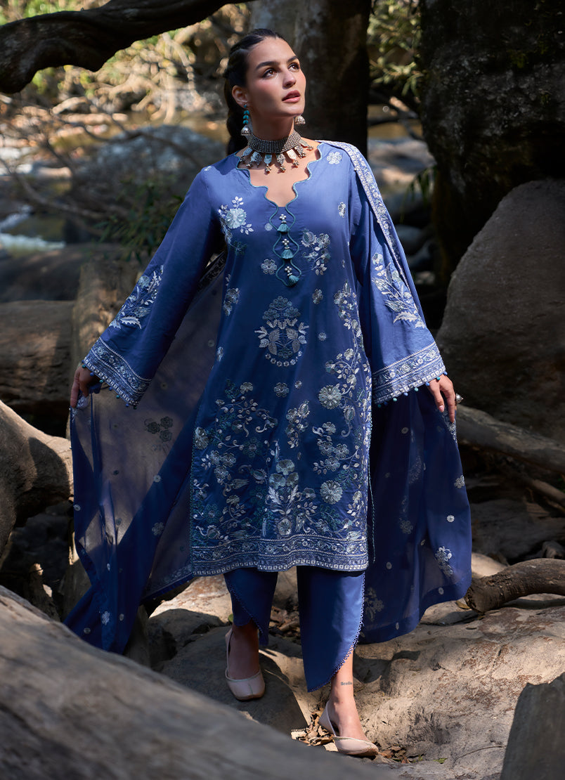 Rich and striking, this royal blue unstitched ensemble is crafted from pure cotton lawn, adorned with intricate floral and ornamental embroidery that creates depth across the fabric. Contrasting motifs and finely detailed borders enhance the design, while subtle accents add a refined artisanal feel. Paired with a pure cotton cambric trouser and a voile dupatta that complements the print, this set is ideal for statement summer dressing with timeless appeal.