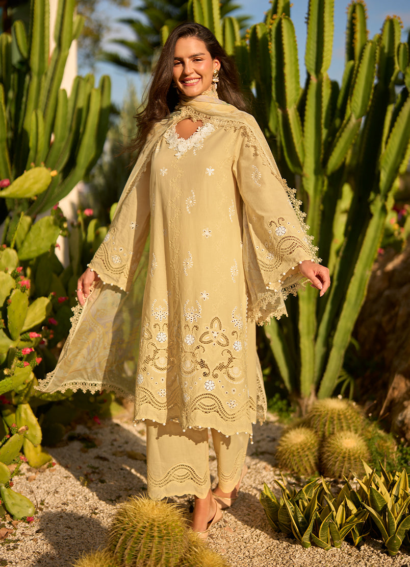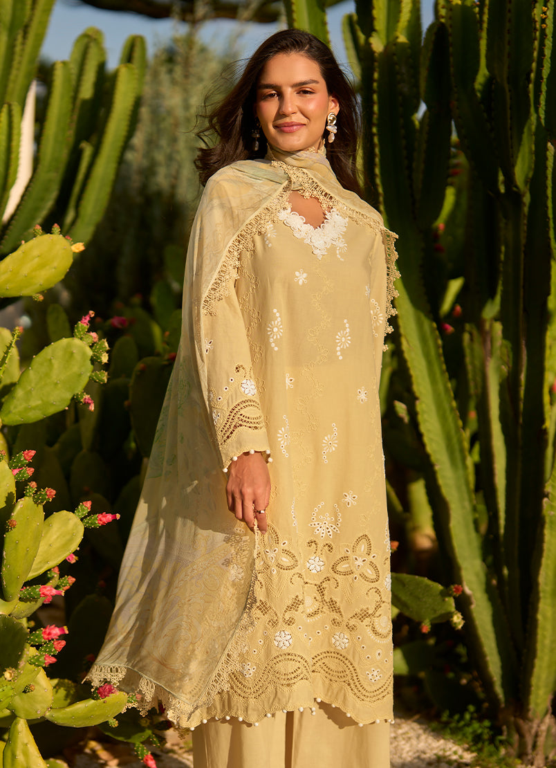 Radiant and uplifting in a soft yellow hue, this unstitched ensemble is crafted from pure cotton lawn, featuring delicate embroidered motifs and intricate cutwork patterns that bring texture and depth to the fabric. Gracefully designed borders and fine detailing enhance its airy, sunlit feel. Paired with a pure cotton cambric trouser and a lightweight chiffon dupatta that adds fluidity, this set is perfect for bright summer days and effortless seasonal dressing.