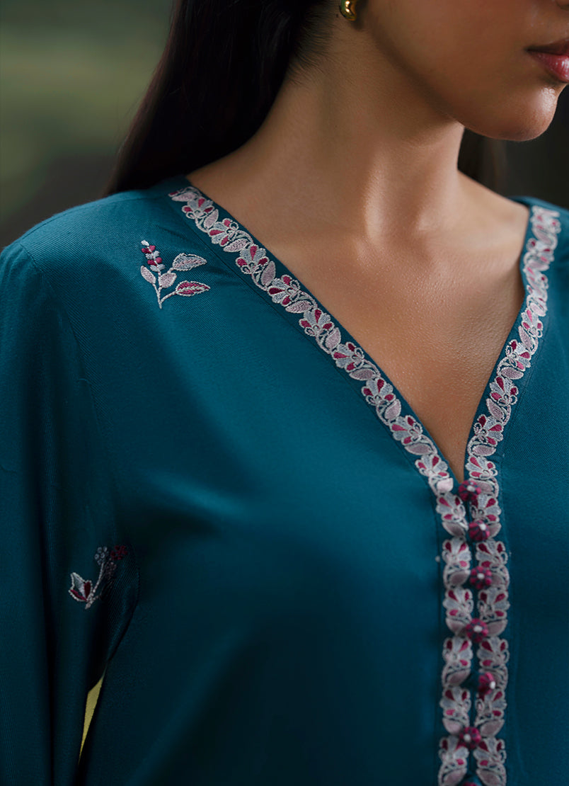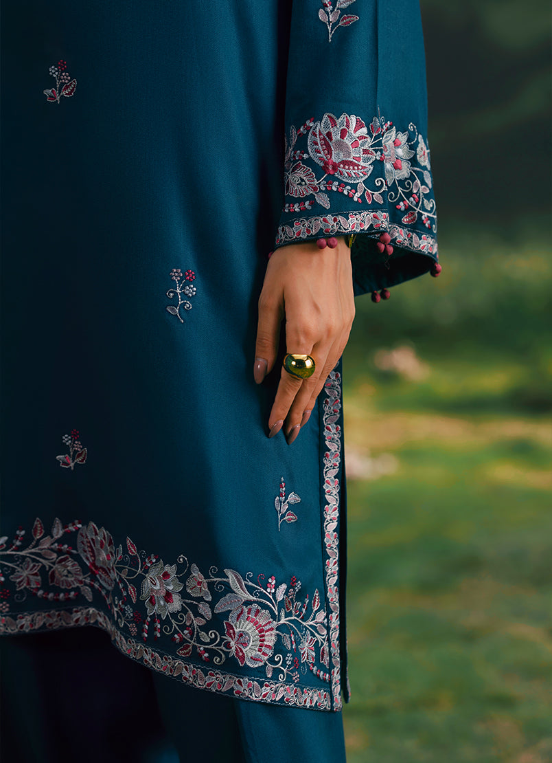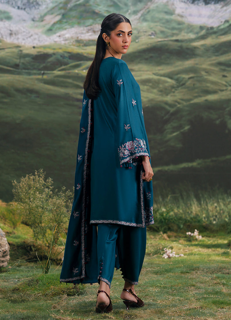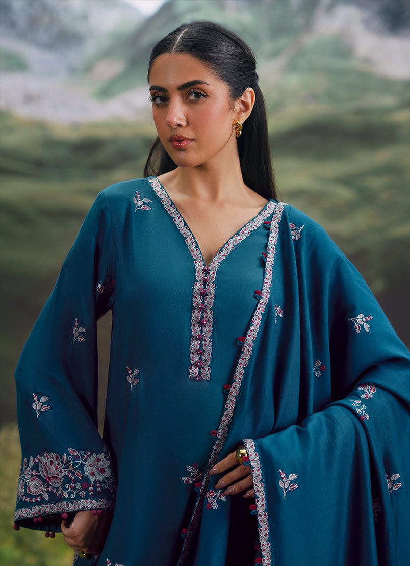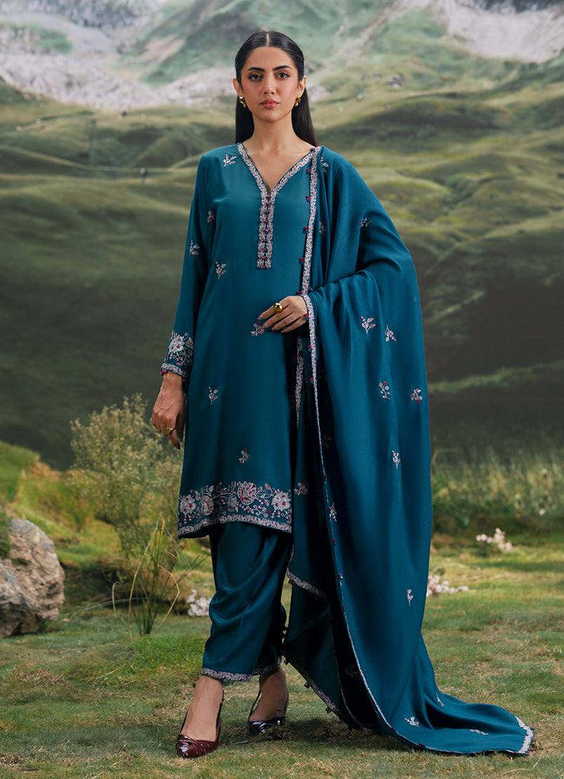 Setarah in Teal from our Winterkari '25 Collection. An embroidered twill viscose 3pc unstitched outfit.