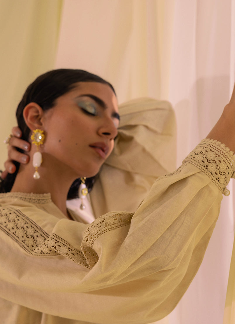 The Beige Jacquard Solid Co-ord Set from our Spring Collection '25 Collection features a straight silhouette, band collar, full length sleeves, paired with straight trousers.