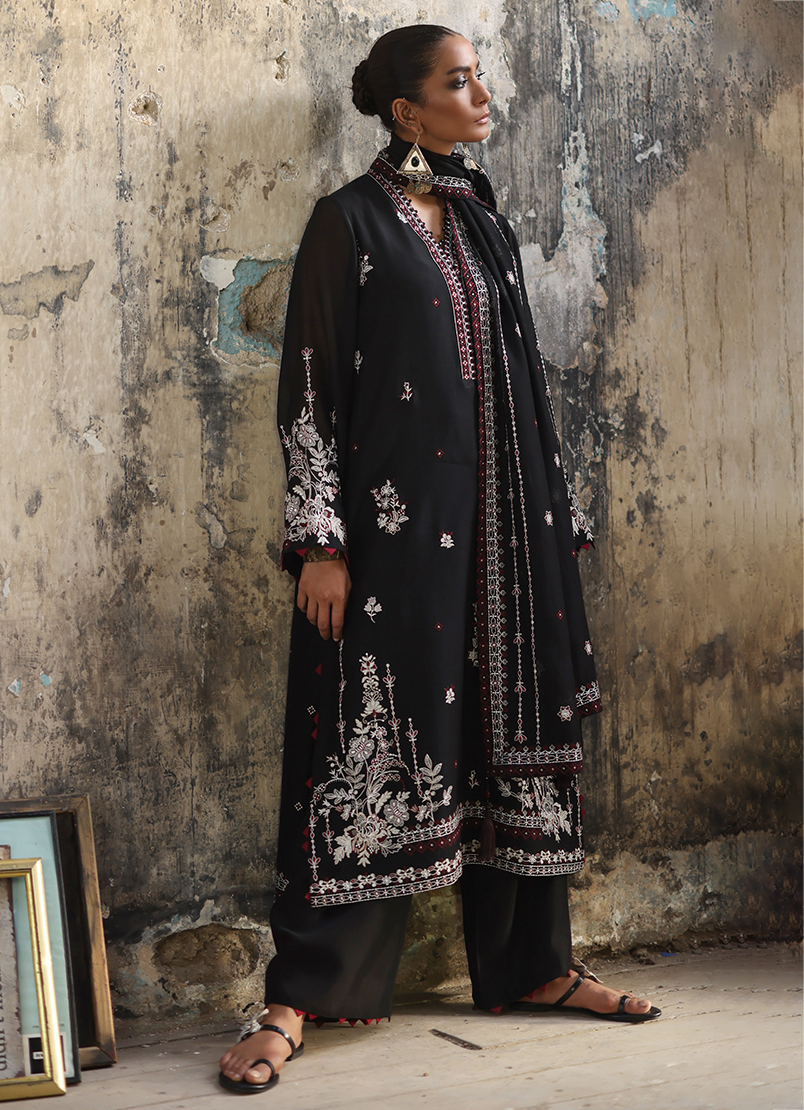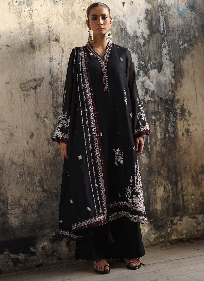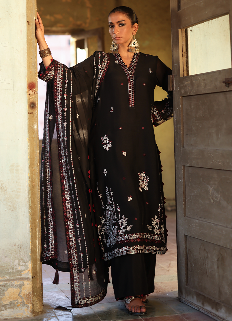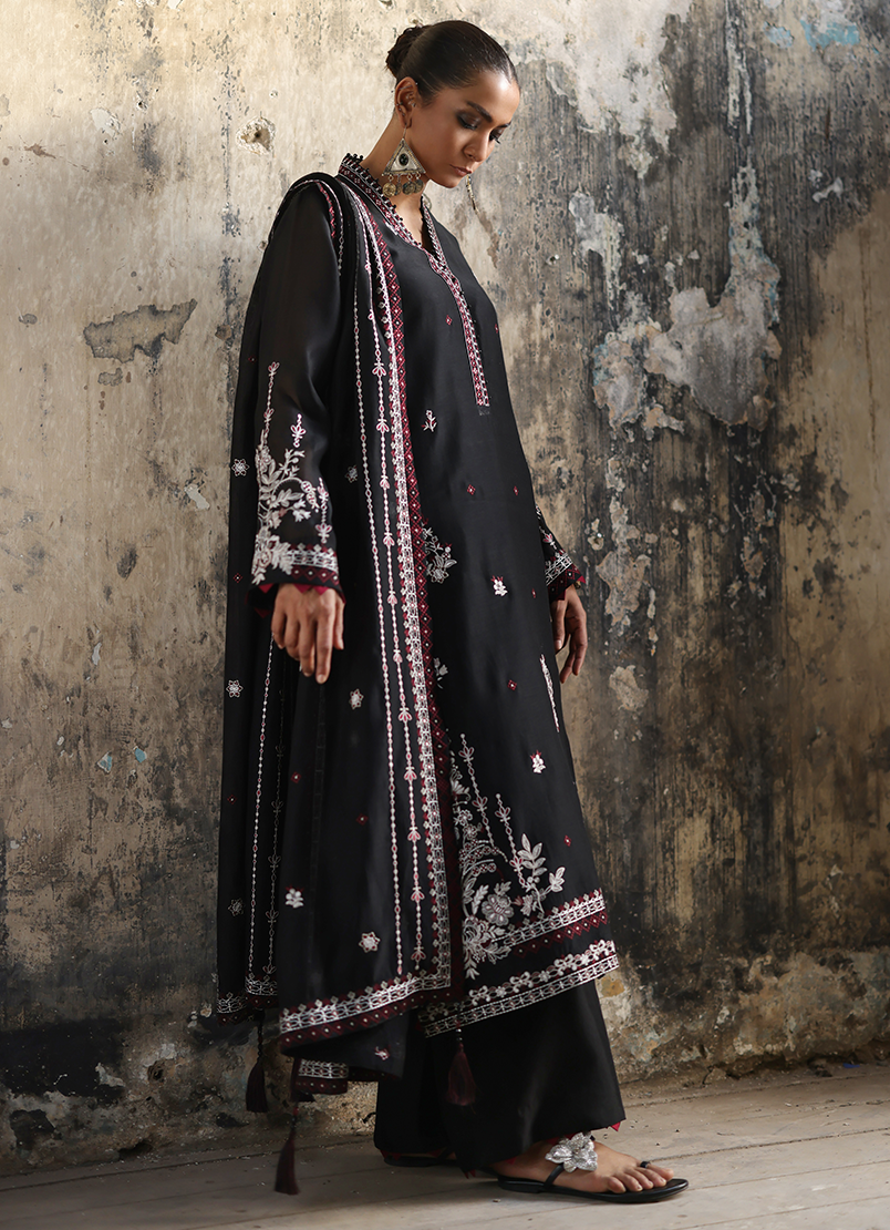 Tara in Black from our Reshamkari Collection. An Embroidered Silk Chanderi 4-piece outfit paired with trousers & embroidered dupatta.