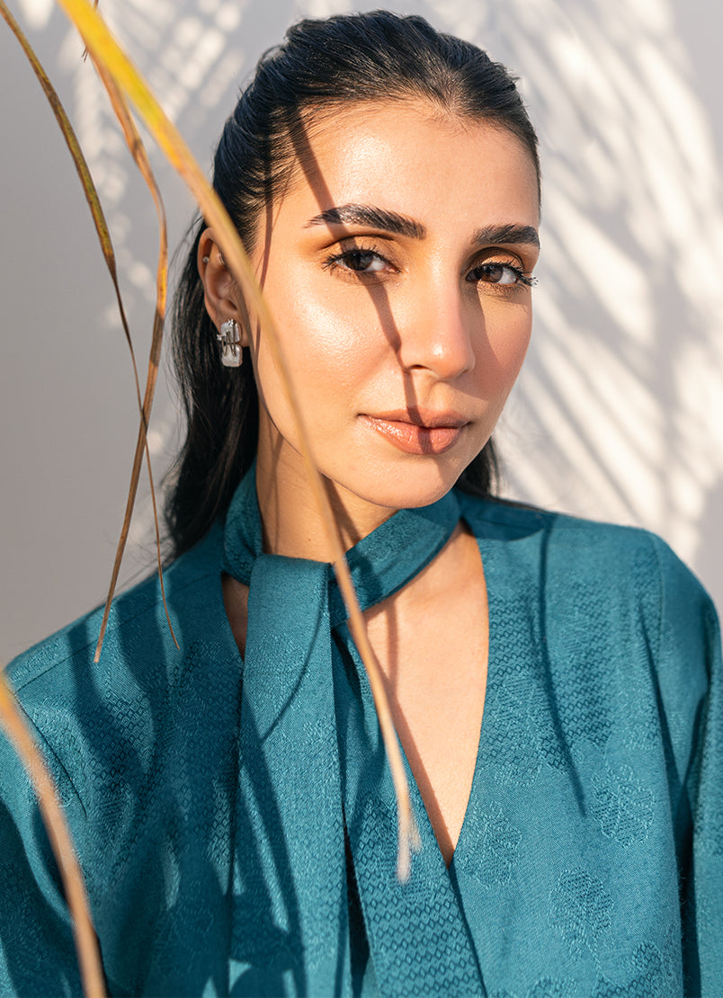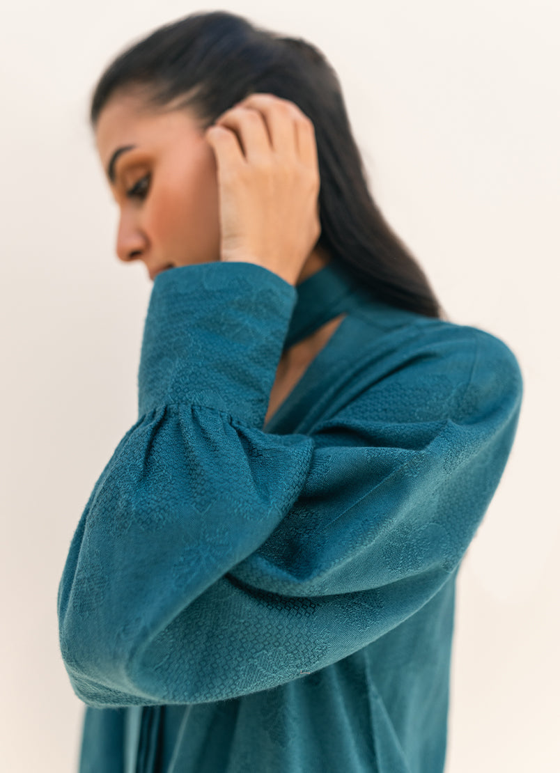 This dark teal textured co-ord set allows for the shirt to fall gracefully in a flowing silhouette, pairing well with the loose-fitting pants in warm dobby viscose material to keep you cozy during the winter season. The stylish cuffed sleeves add a touch of flair to the simple v-neck shirt.