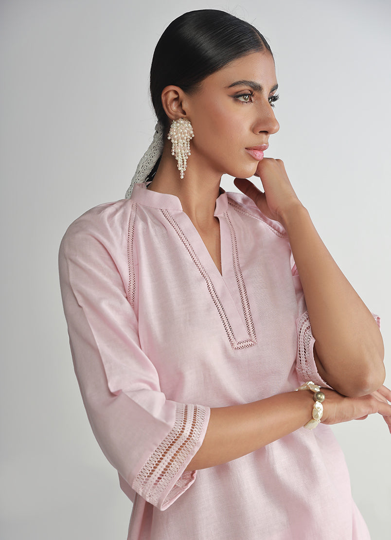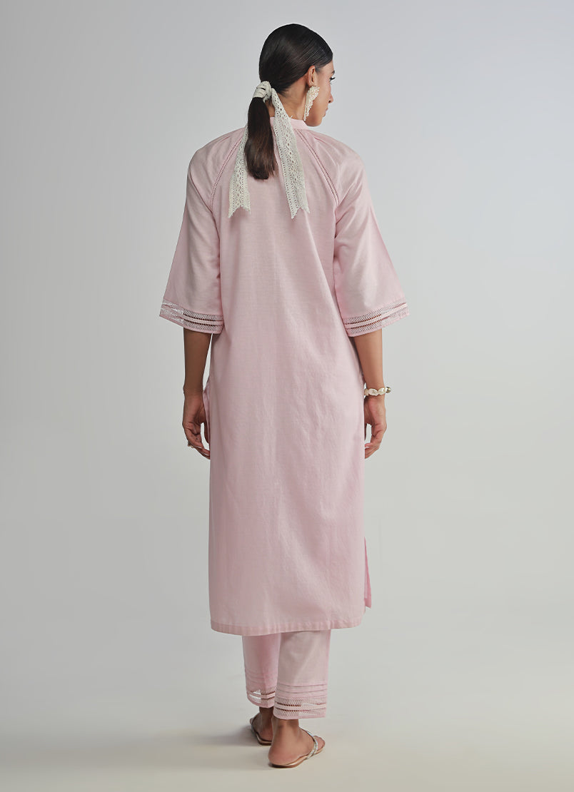 The Pink Textured Co-ord Set from our Legends of Fall '24 Collection. An A-line shirt, band collar, three quarter bell sleeves paired with trousers.