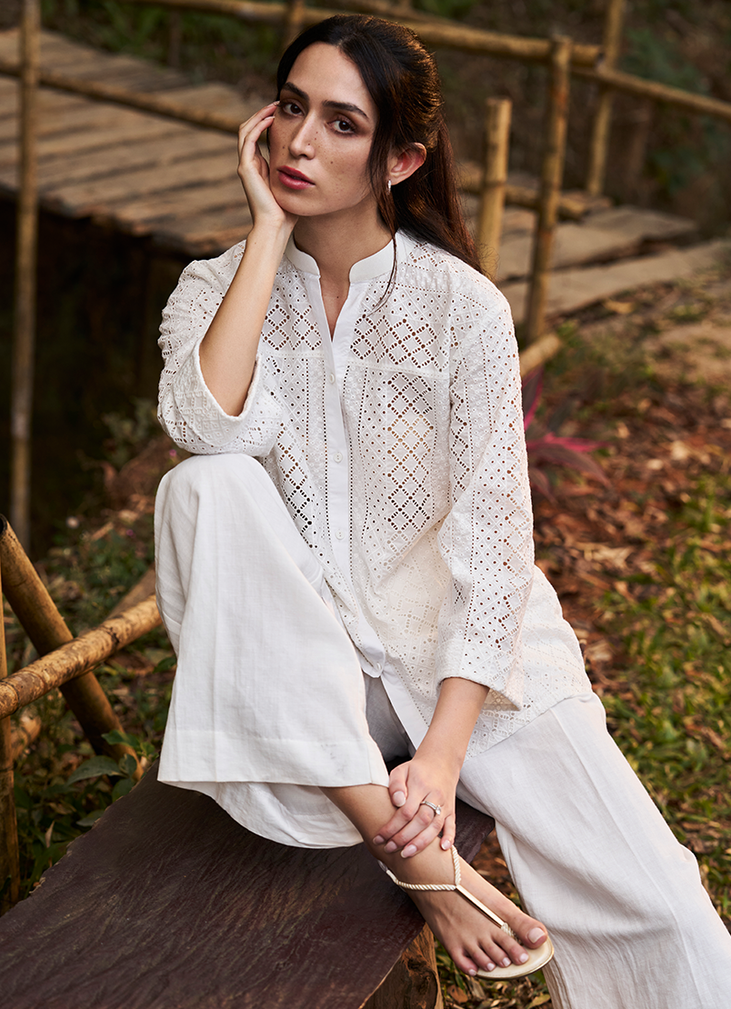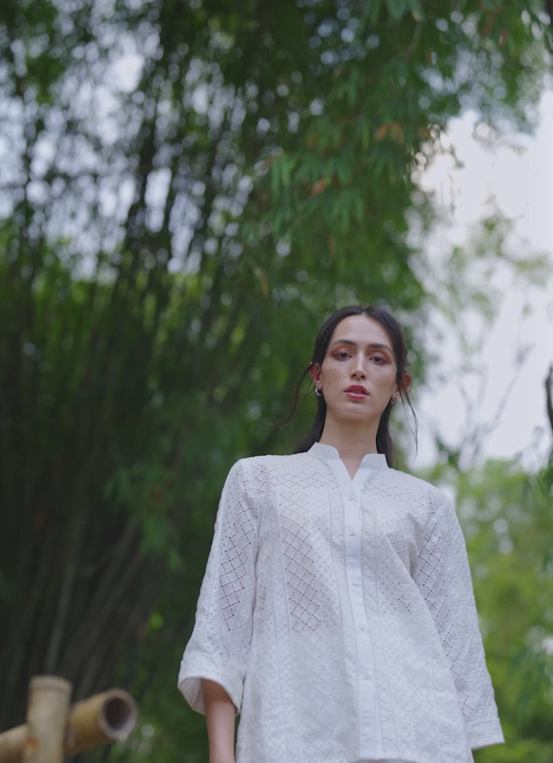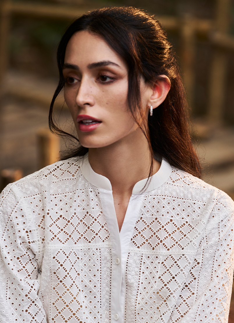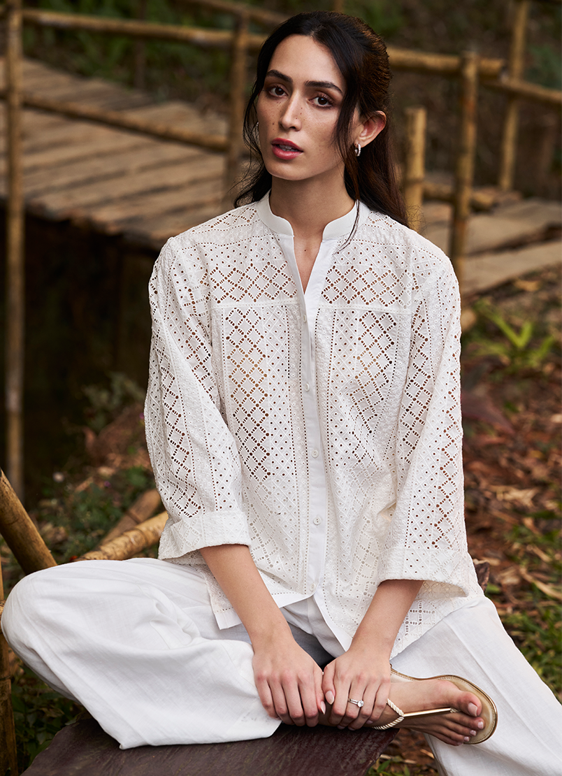 Button-down shirt with three quarter sleeves, ban collar, and schiffli embroidery throughout the shirt.