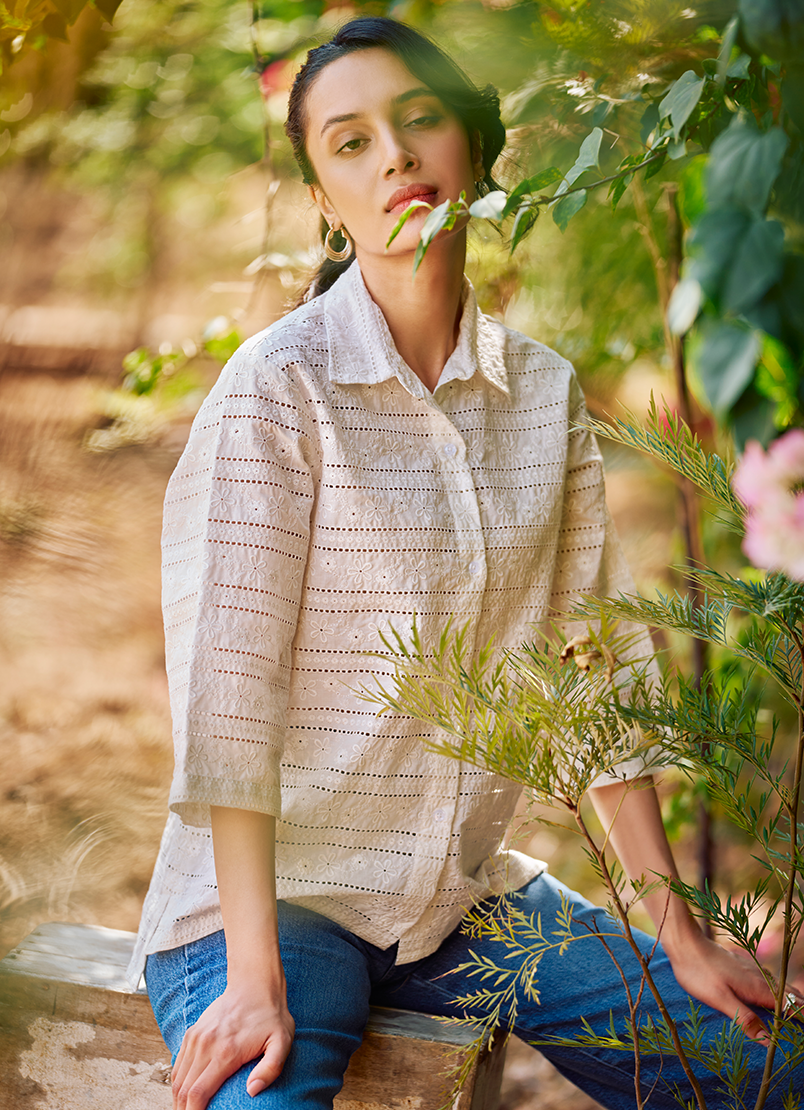 The shirt's folded collar, with three quarter sleeves is enhanced by intricate floral chikan embroidery all over the button-down shirt.
